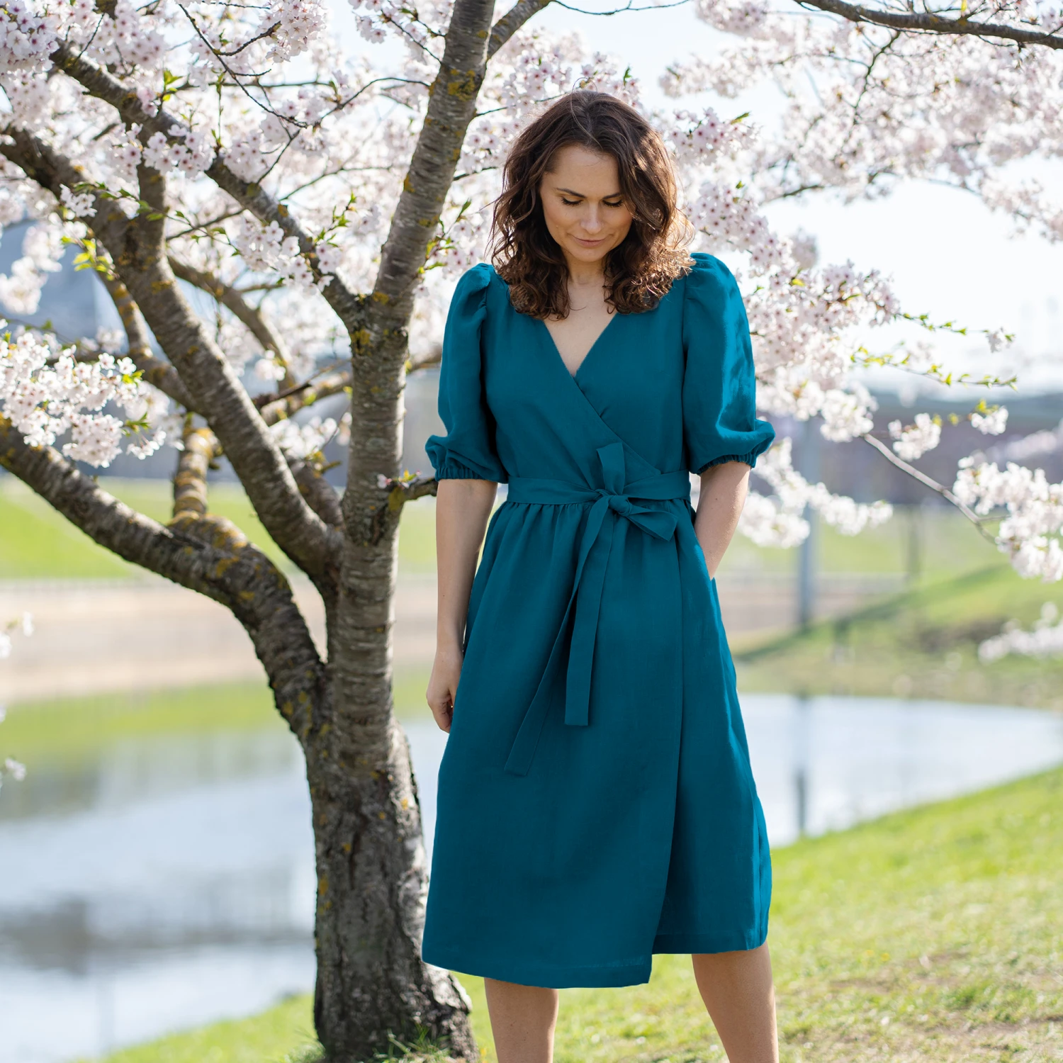Experience effortless style with our stunning 100% linen bubble sleeve dress Belle. Crafted from 100% linen, this puff sleeve dress showcases a flattering V-neckline, sculptural puff sleeves, and a graceful wrap silhouette with waist-cinching ties. Slip pockets and a midi length add more practicality, making this midi dress perfect for picnic dates or leisurely lunches.