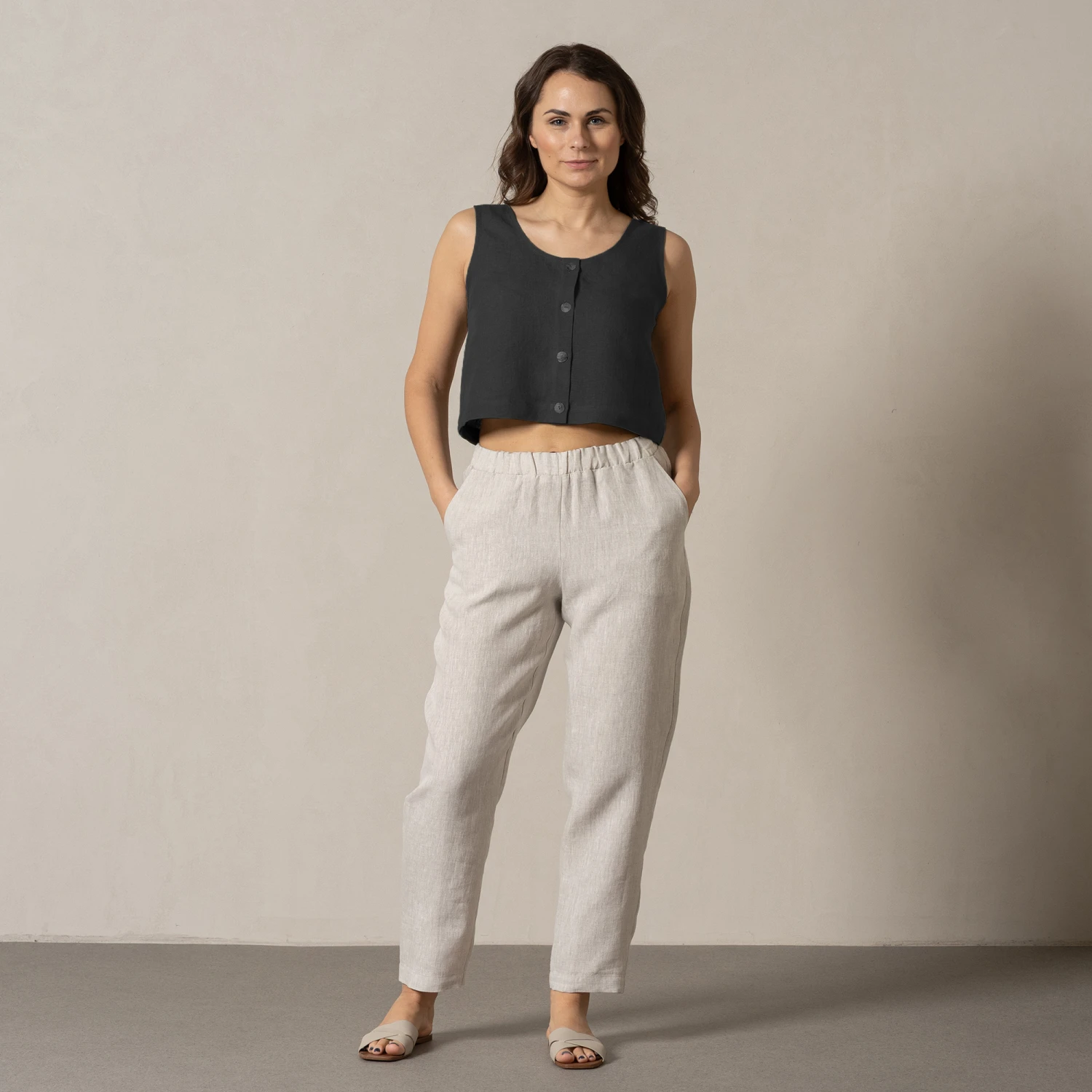 Linen crop top Monica features a charming button front adorned with sea shell buttons. Enhanced with a round neck, strategically placed chest darts, and bra-friendly straps, Linen crop tank top promises a flattering and comfortable fit, making it suitable for both casual wear and semi-formal occasions.