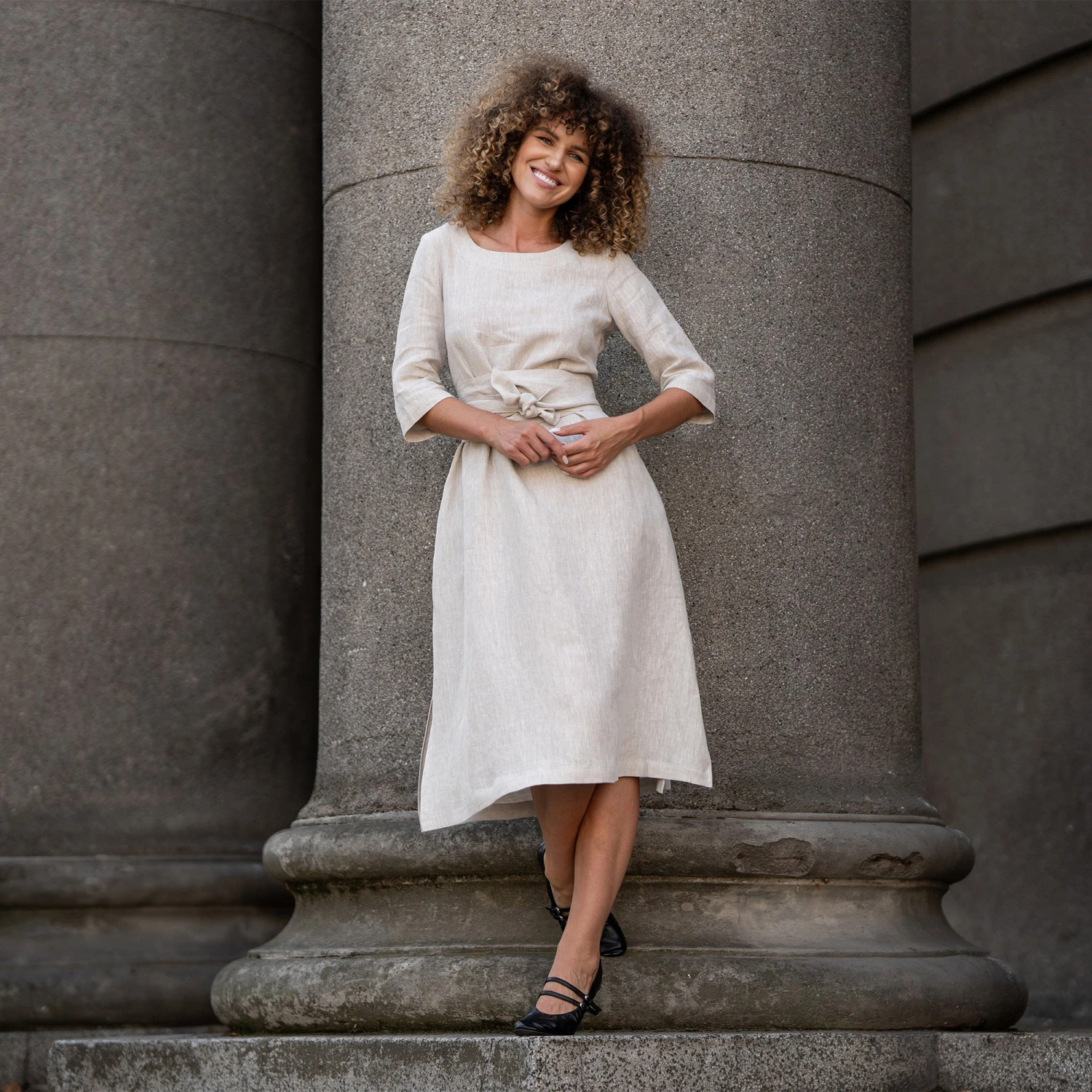 Crafted from 100% European linen, this lightweight summer dress for women keeps you cool and comfortable, allowing your skin to breathe even on the hottest days. The sewn-in obi-style belt cinches the waist, sculpting a flattering hourglass silhouette with effortless grace. Designed for both style and practicality, our wrap dress features two hidden side pockets and elegant side slits, adding a touch of charm while ensuring ease of movement.
