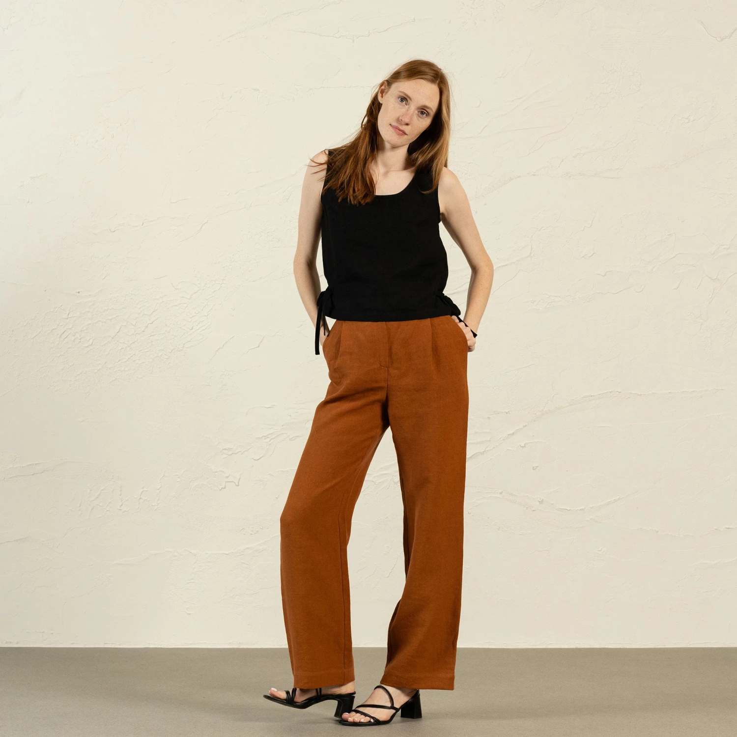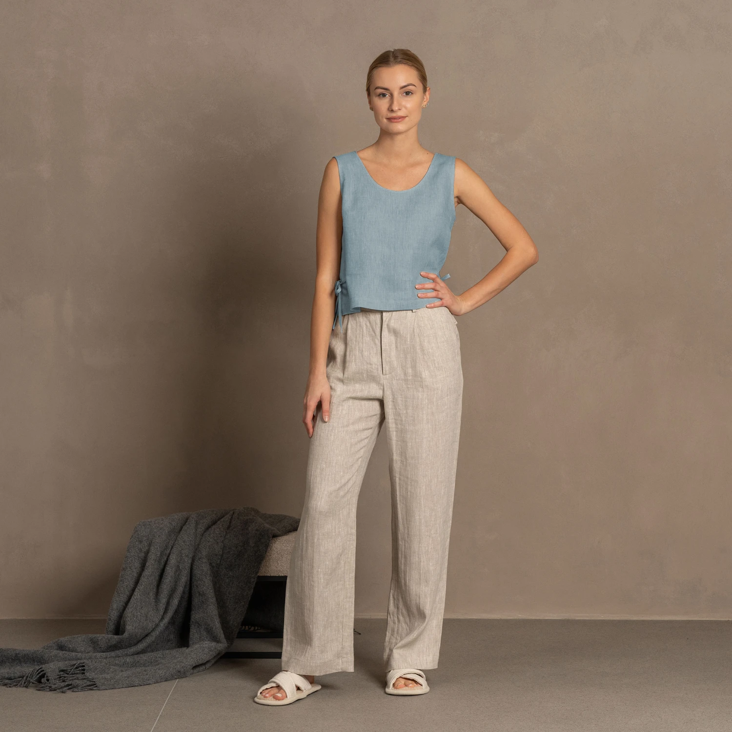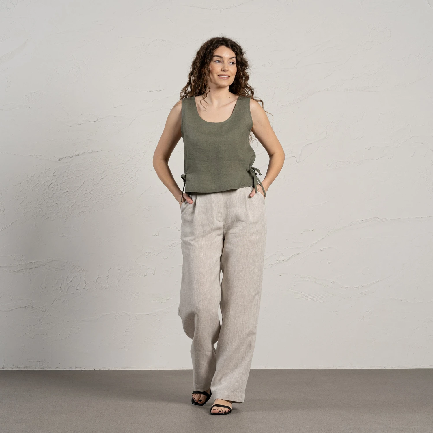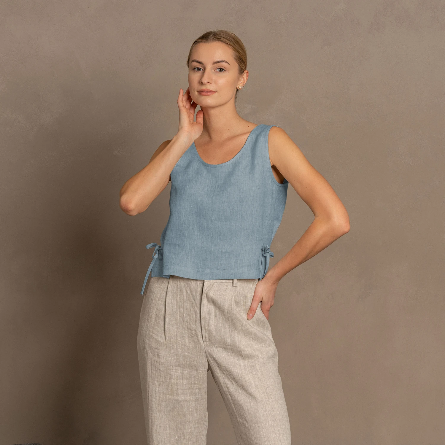 Crafted from 100% sustainable Linen fabric, our crop top blouse features delicate side straps that elegantly tie into charming ribbons, adding a touch of refinement to your summer outfit. Effortlessly pair this sustainable, sleeveless Linen crop top with pleated pants, trousers, or shorts, and you are ready for adventures.