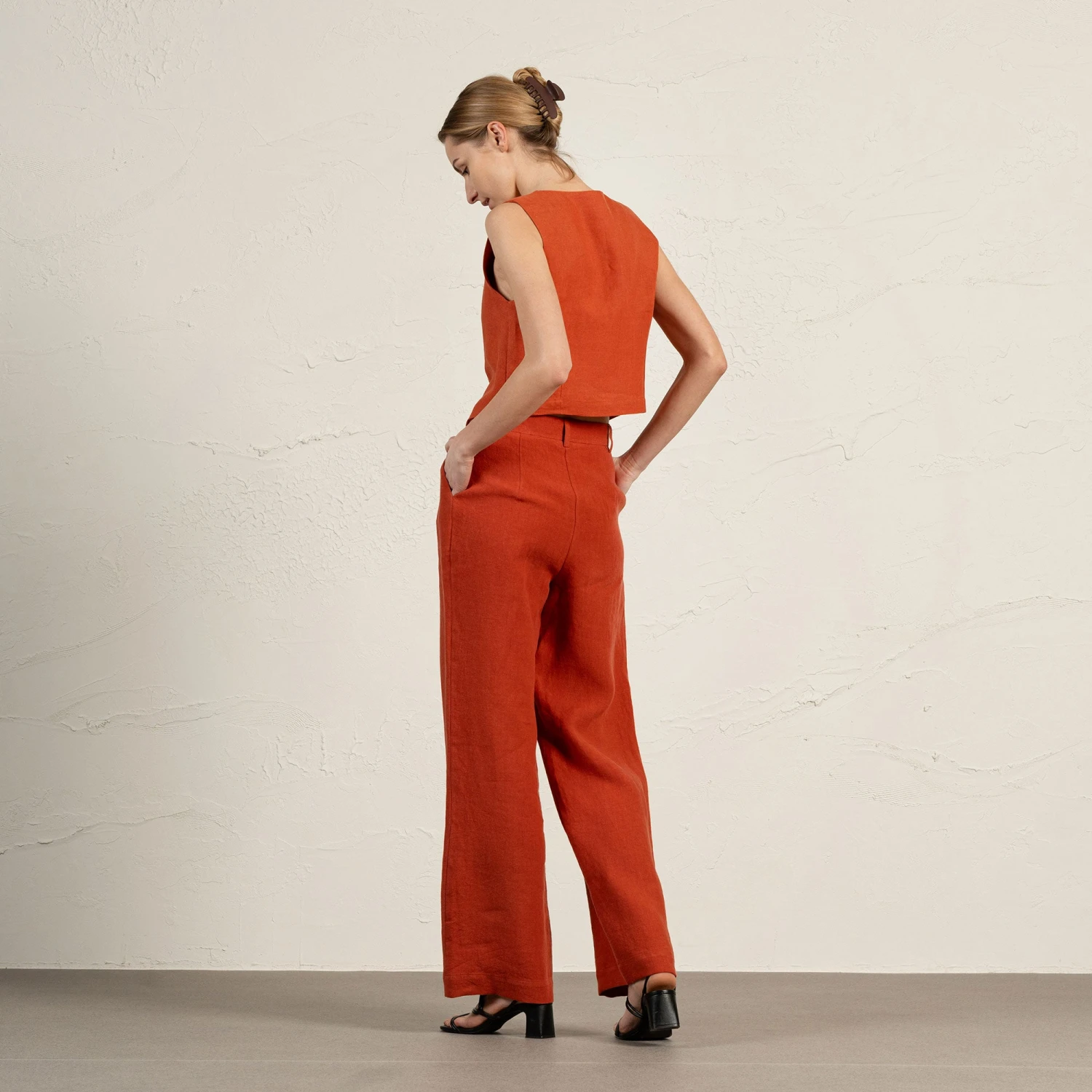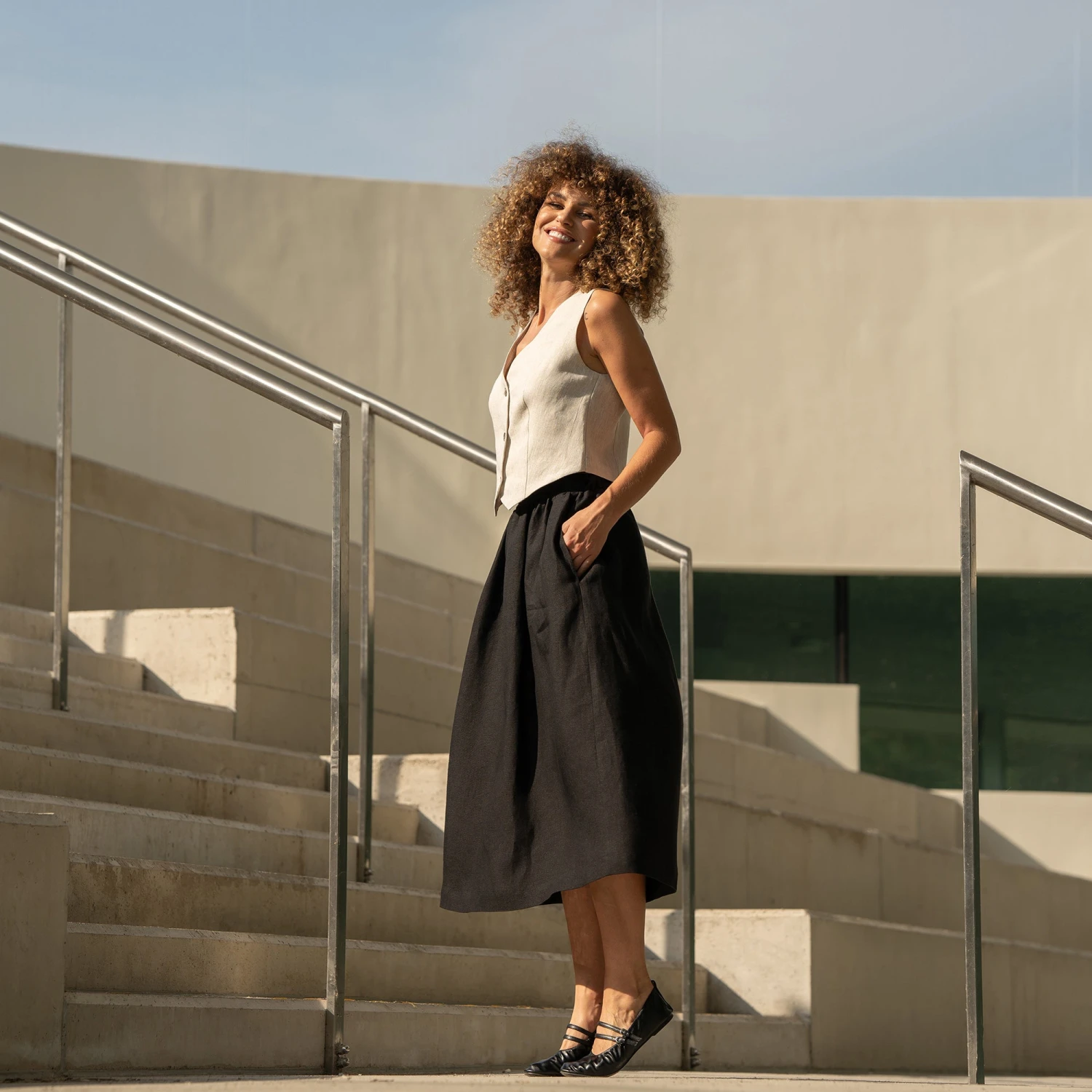 Our Linen Waistcoat is a wardrobe essential, made from 100% European linen for breathability and comfort. Featuring a flattering V-neckline and versatile button closure, this lightweight vest can be worn open for a laid-back vibe or buttoned up for a more polished, tailored fit. Perfect for layering throughout the year.