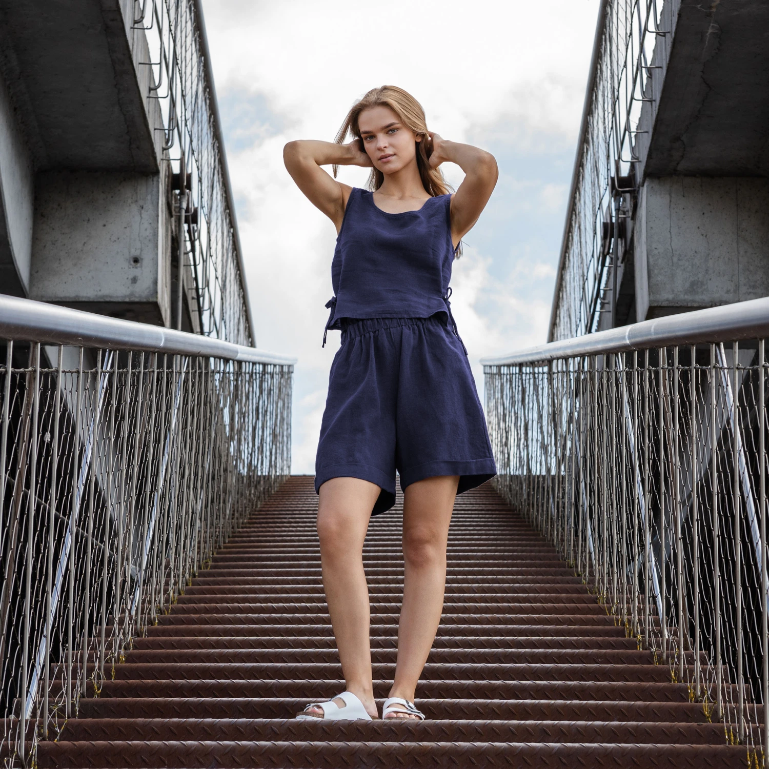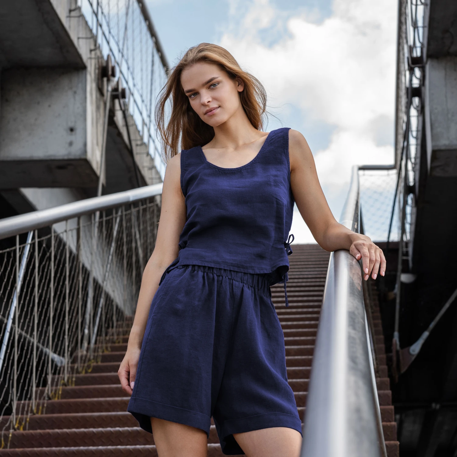 Made from 100% European linen, our crop top blouse showcases delicate side straps that tie into graceful ribbons, bringing an elegant touch to your summer look. Modern style this sleeveless linen top with pleated pants, trousers, or shorts for a chic, adventure-ready outfit.