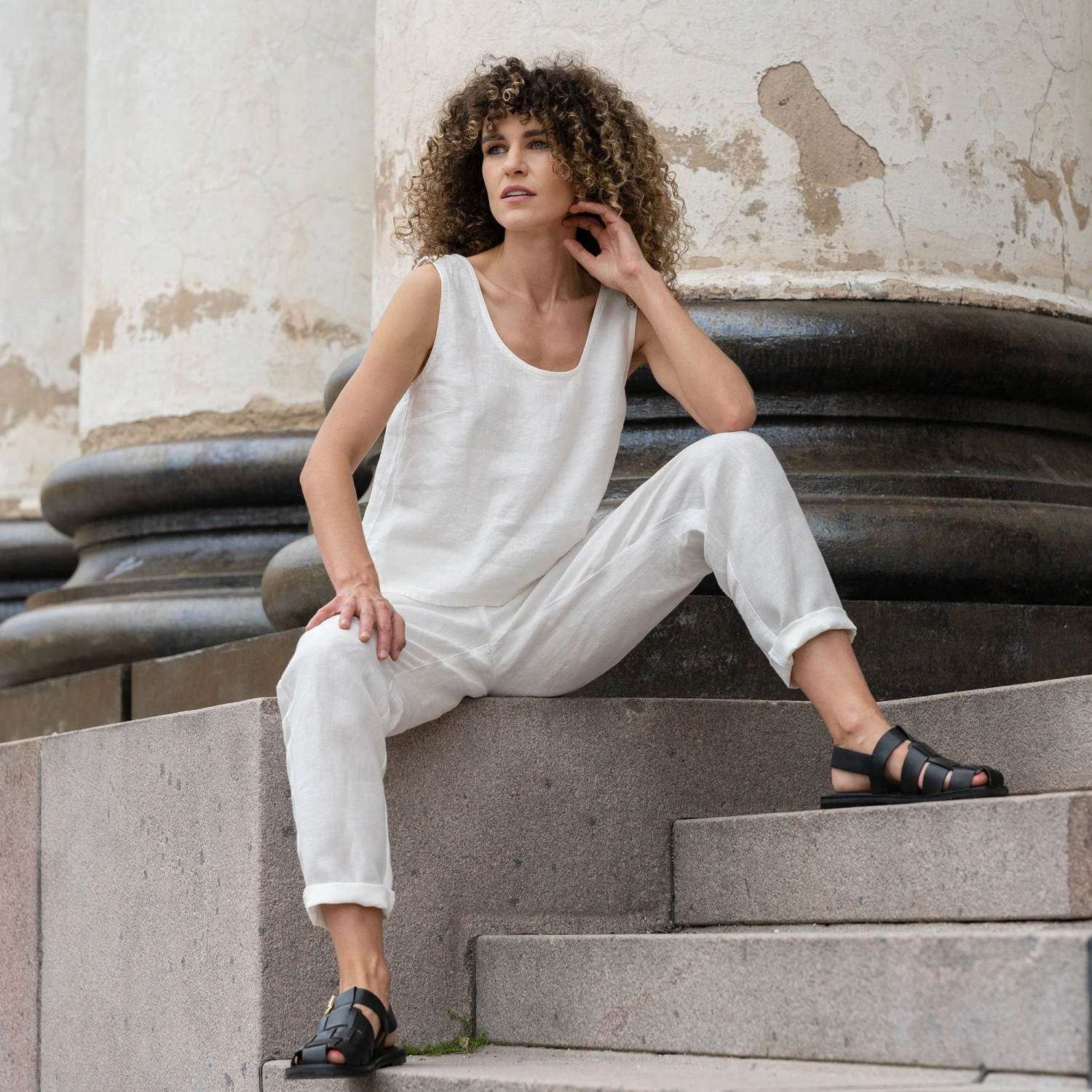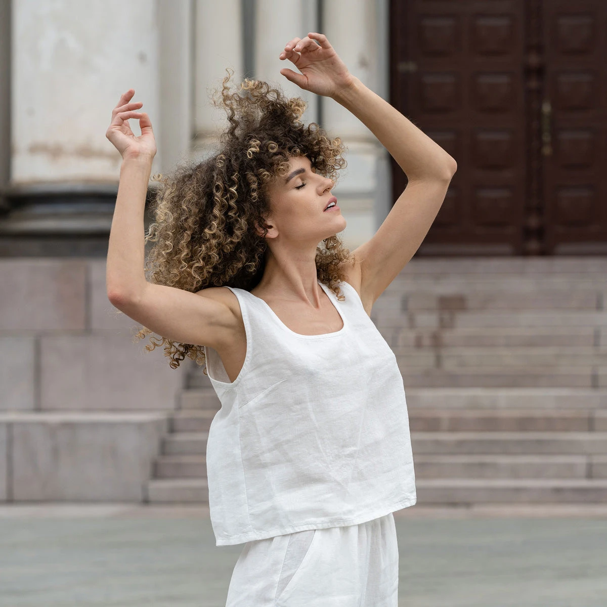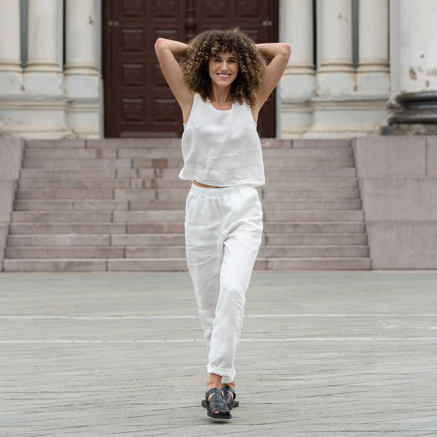 Two-piece set is made from 100% Linen, which is not only sustainable and organic but also incredibly soft and breathable. The Ana crop top blouse and Dakota trousers are designed to keep you comfortable all day long.