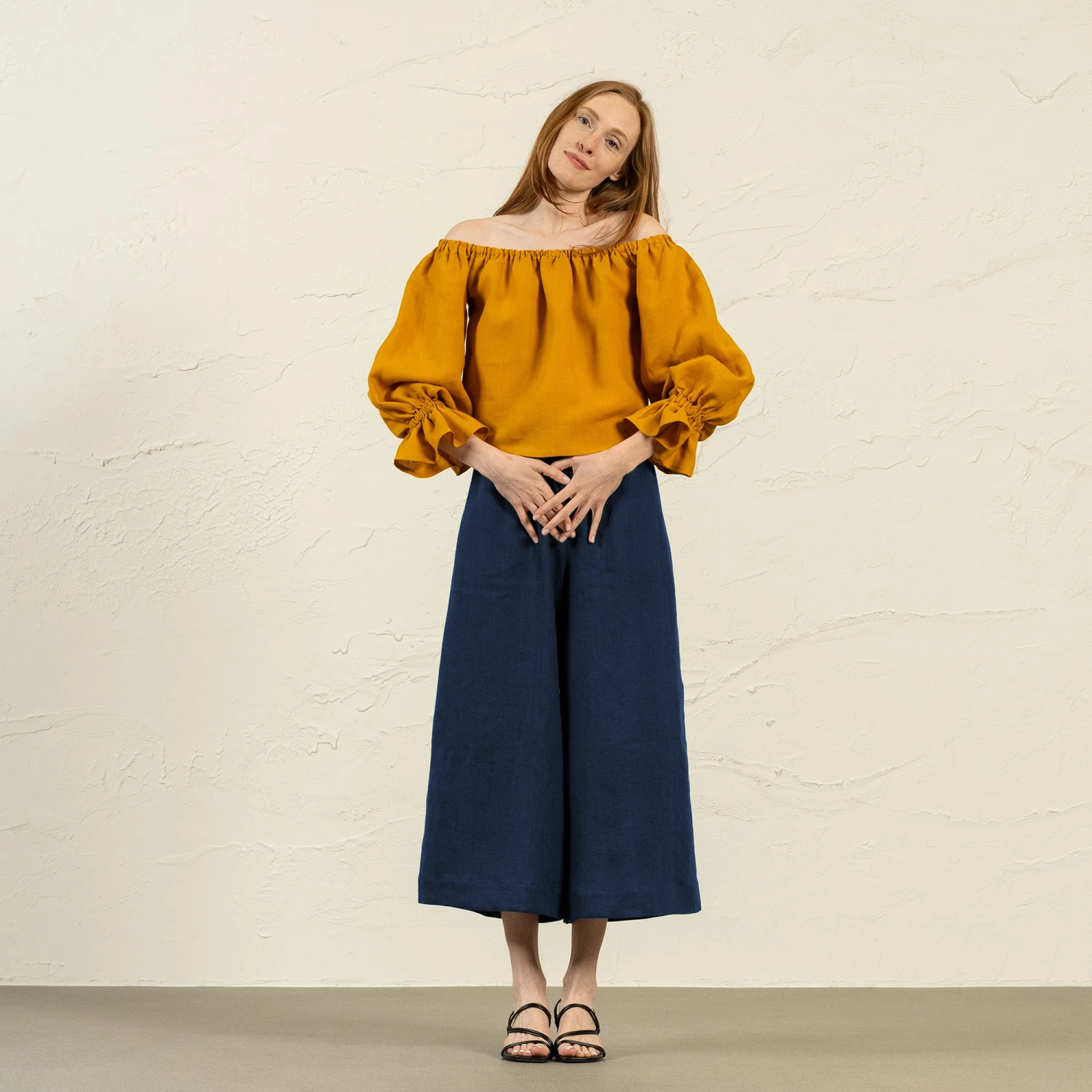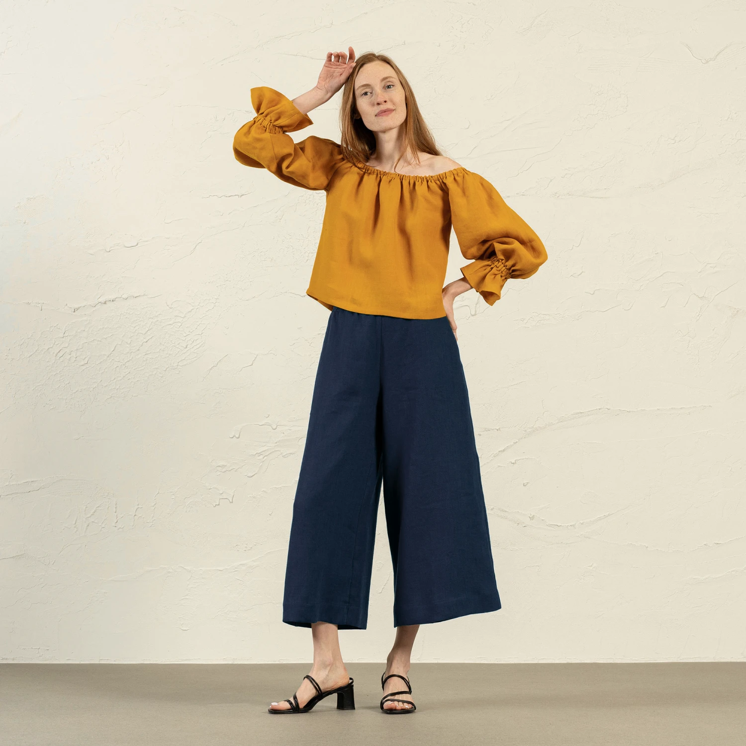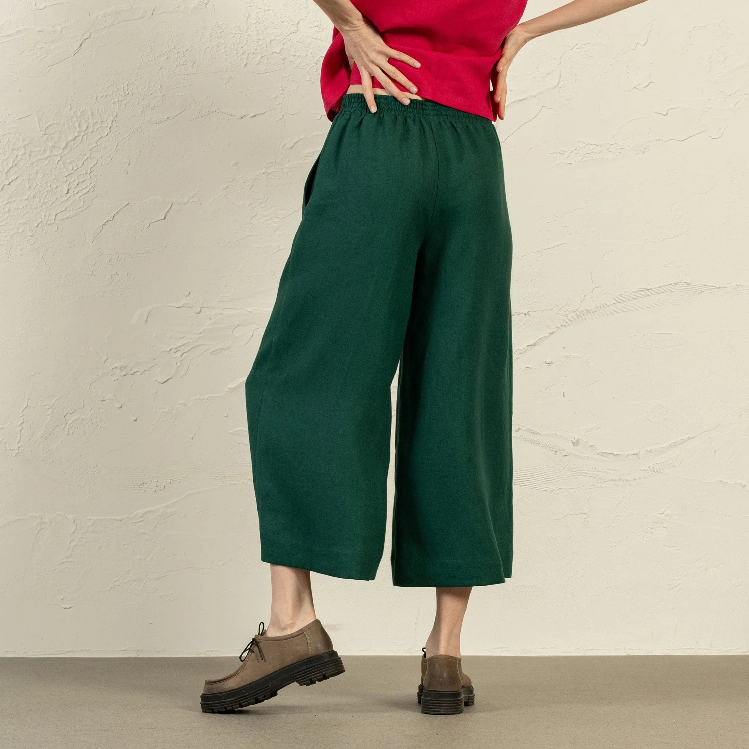 Discover our 100% Linen culottes Lana tailored for stylish women. Mid-rise trousers boast a comfortable elastic waistband that guarantees a relaxed fit with a boho-inspired twist. Sustainable wide-leg wonders come in a cropped length with practical side seam pockets for a touch of everyday.