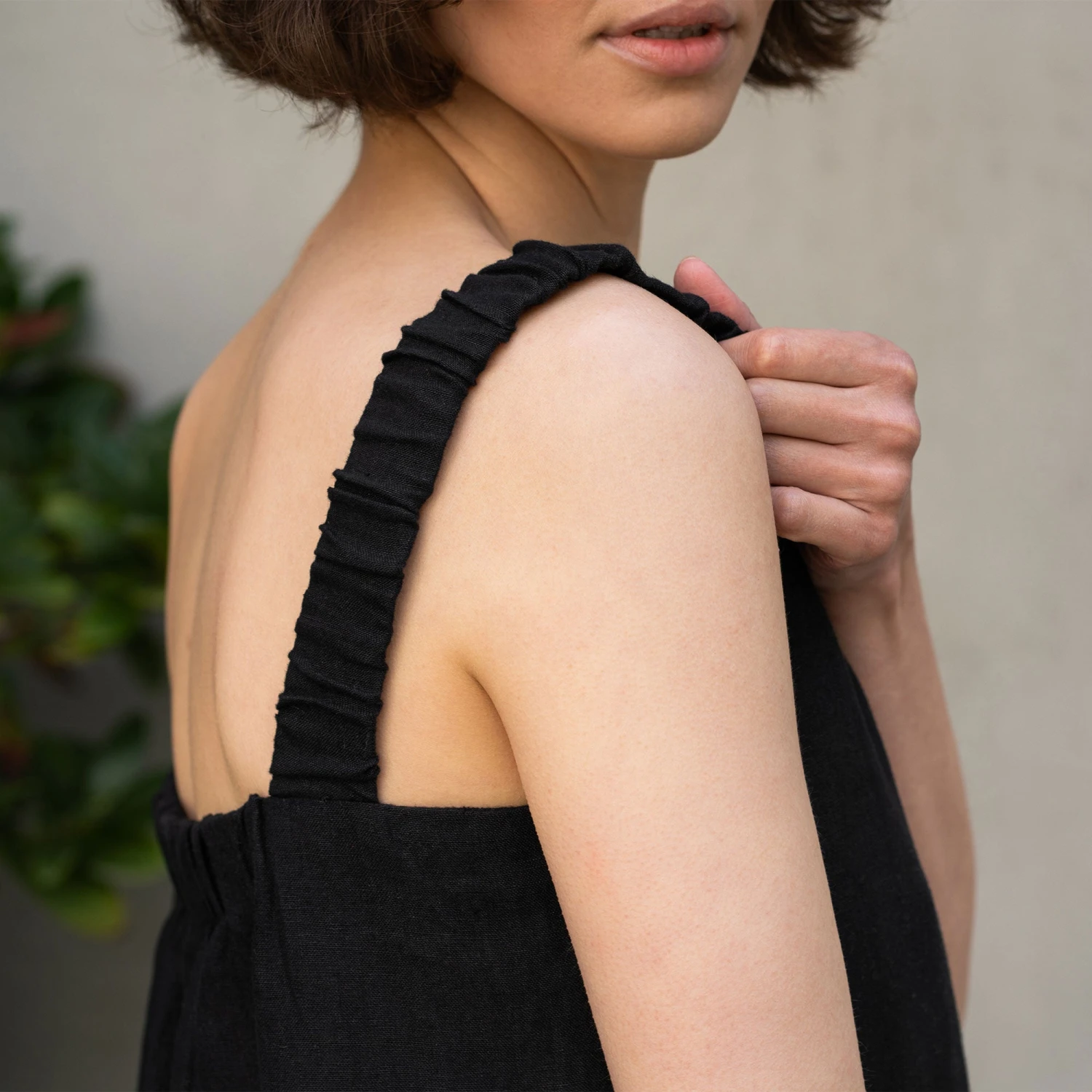 Sleeveless maxi dress features square neckline and straight pinafore silhouette. The elasticated back ensures a comfortable and flexible wear, allowing you to move with ease. Crafted from washed midweight 200gsm Linen fabric, this dress offers a luxurious feel while maintaining breathability on those hot summer days.