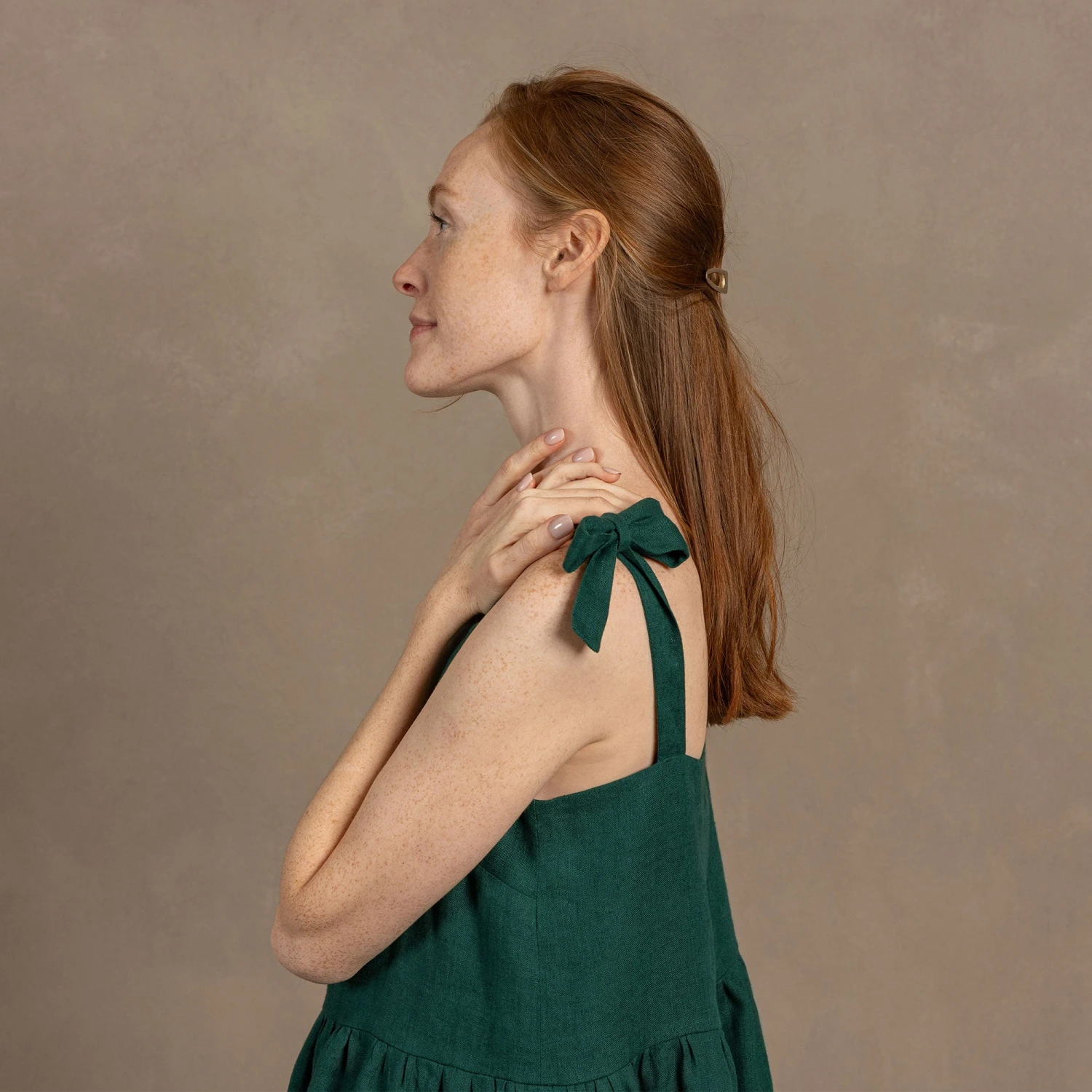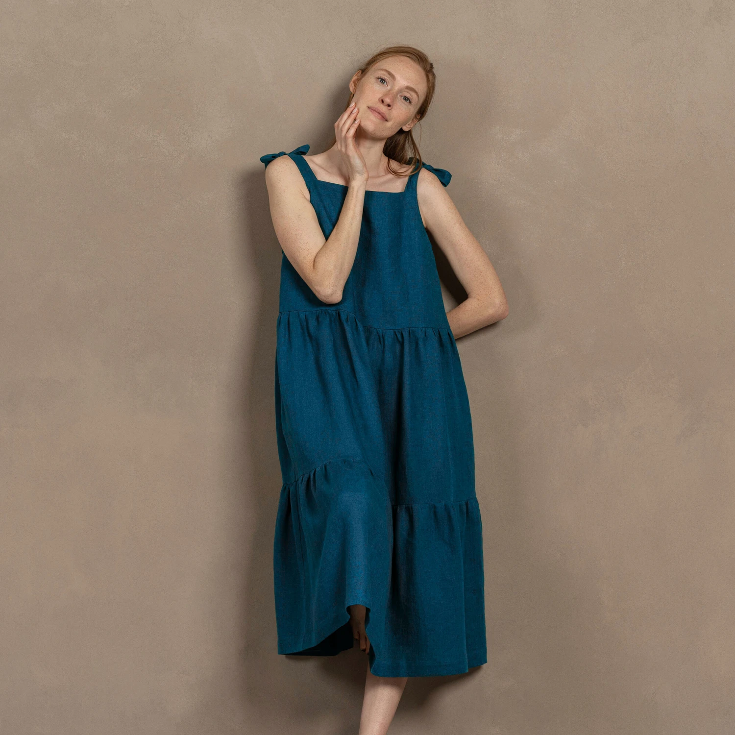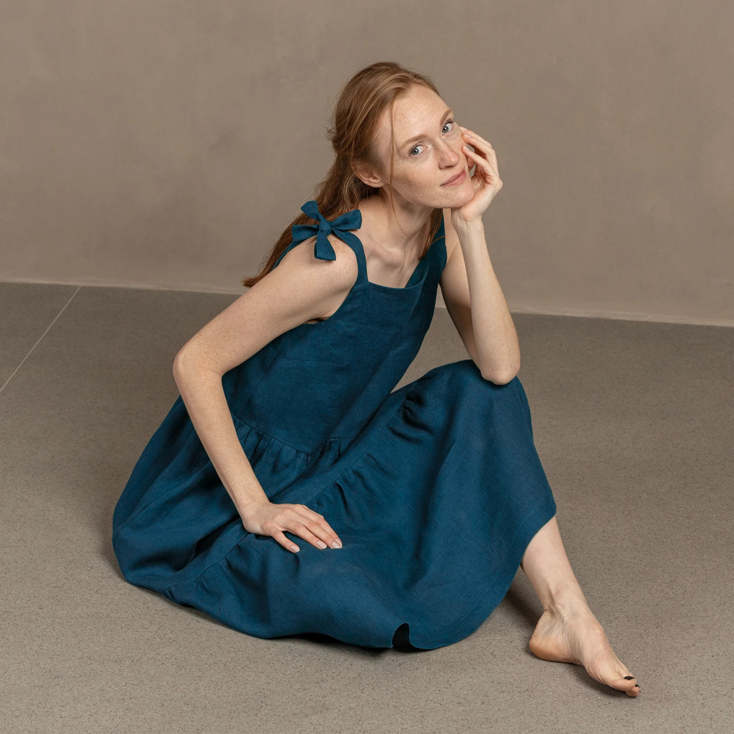Sleeveless pinafore dress designed with adjustable straps for a personalized fit. Our 100% Linen dress features a square neck, loose-fitting silhouette, drop waist style, and midi length, and subtle chest darts that enhance shaping around the bust area. Uma offers a relaxed yet dreamy look.