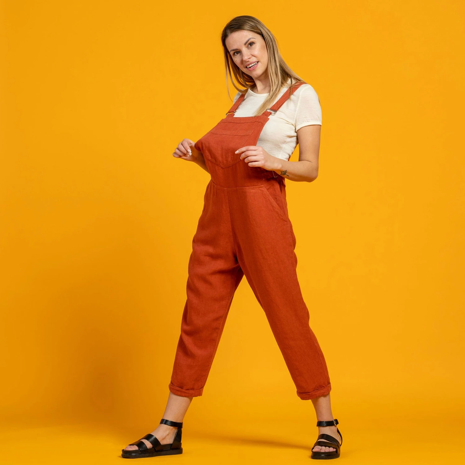 Feeling excited about rising temperatures? Tap into your inner, most optimistic child with this playful romper. Designed for maximum comfort during warm days, the organic jumpsuit is sustainably made from 100% Linen which is well-known for its moisture-wicking properties. Plus, you can wear this linen jumpsuit for any occasion – for beach trips, walks in the park, and outdoor happy hours. Without much thought, throw a Merino wool tee into the mix to channel a look that never dates. With a classic pinafore design, our sustainably made linen jumpsuit features the side straps to define your waistline and the pouch pocket on the chest, making it amazingly cheerful.
