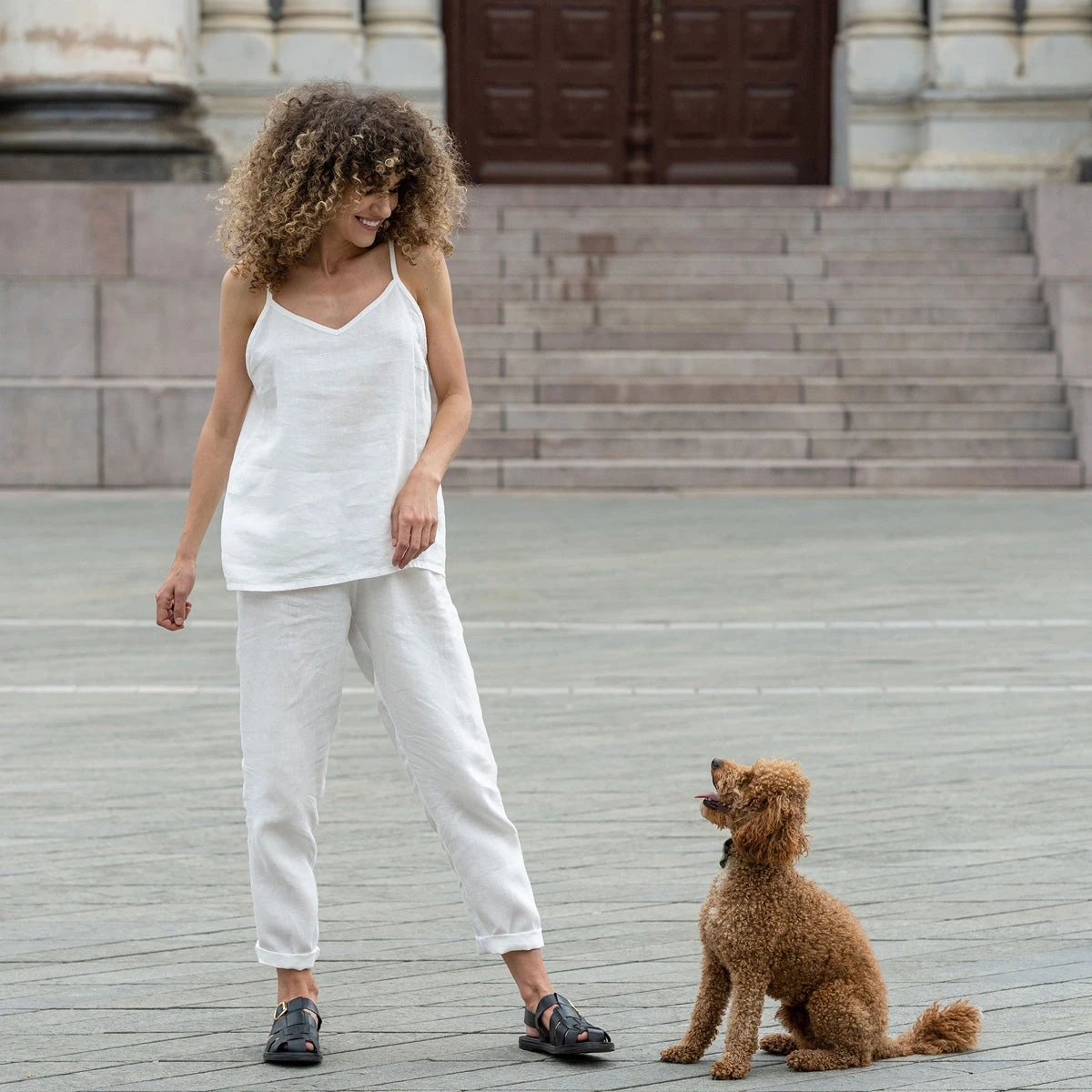 When the sun decides to show her spells for the summer, Flirty Kim slip top beats a truly carefree wardrobe – and looks a light-hearted, nostalgic, and wild. Made from breathable, moisture-wicking, and hypoallergenic 100% Linen, sleeveless camisole features delicate v-neckline and thin spaghetti straps to enhance your shoulder line as well as your neck. Linen blouse is long enough to wear with a pair of jeans or shorts front tucked, knotted, or it can be left out right at the hips. Kim pairs wonderfully with wide leg pants or high waisted linen skirt like our Sophia – a fresh and stylish element to any outfit.