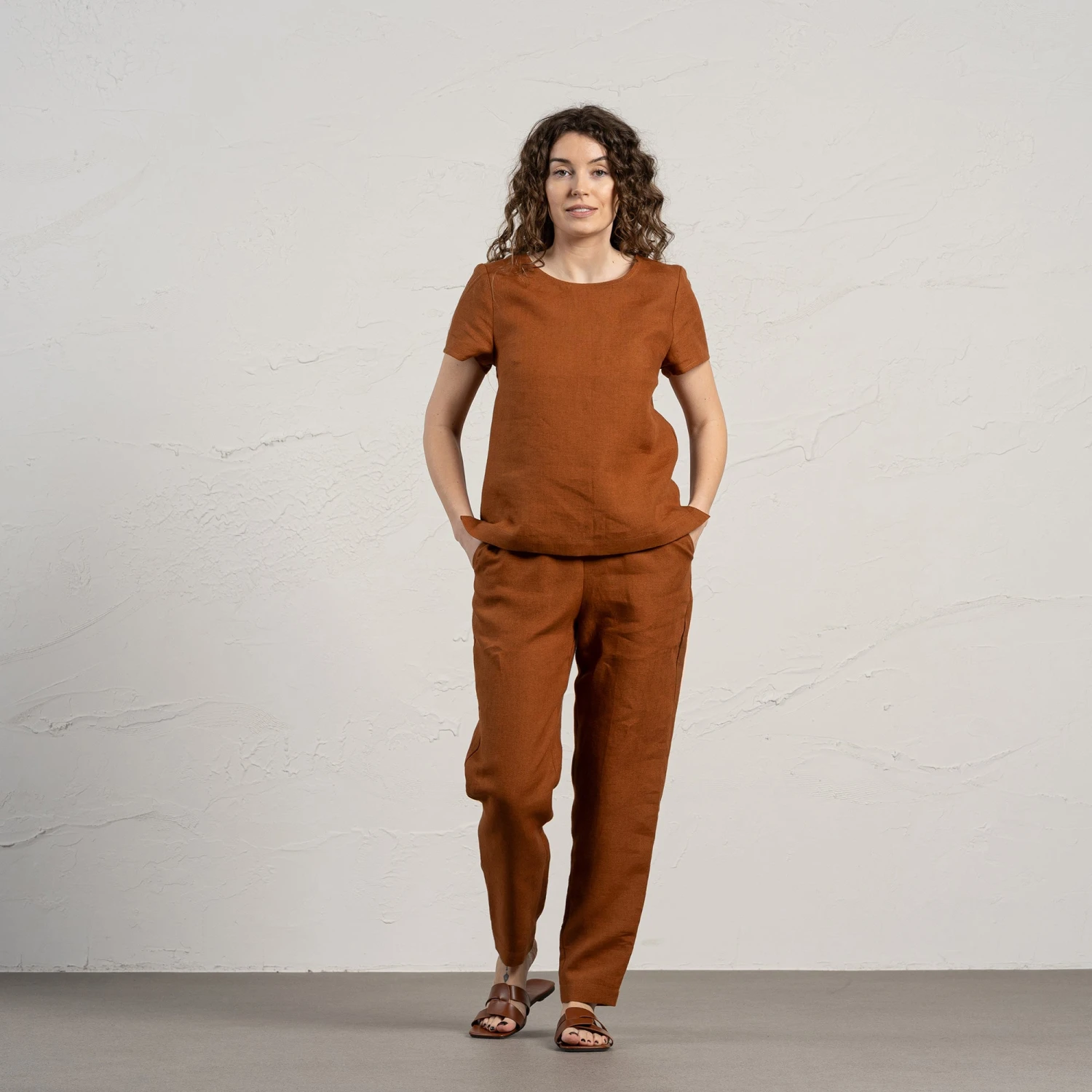 Linen blouse Emma features a round neckline, a relaxed silhouette, and the 100% natural linen fabric makes it a perfect swap for the warmer months. In addition, the linen t-shirt comes with small splits on both sides to comfortably sit around your hip. Whether you like jeans, shorts, or skirts, they all can be paired with our linen top – it can be tucked in or tucked out.