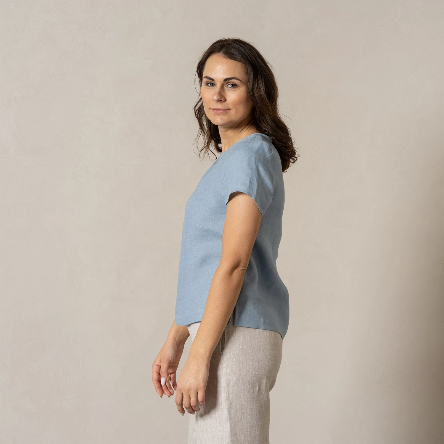 Linen blouse Emma features a round neckline, a relaxed silhouette, and the 100% natural linen fabric makes it a perfect swap for the warmer months. In addition, the linen t-shirt comes with small splits on both sides to comfortably sit around your hip. Whether you like jeans, shorts, or skirts, they all can be paired with our linen top – it can be tucked in or tucked out.