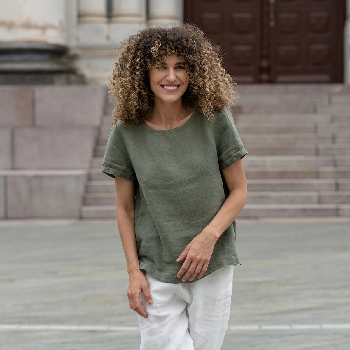 Linen blouse Emma features a round neckline, a relaxed silhouette, and the 100% natural linen fabric makes it a perfect swap for the warmer months. In addition, the linen t-shirt comes with small splits on both sides to comfortably sit around your hip. Whether you like jeans, shorts, or skirts, they all can be paired with our linen top – it can be tucked in or tucked out.