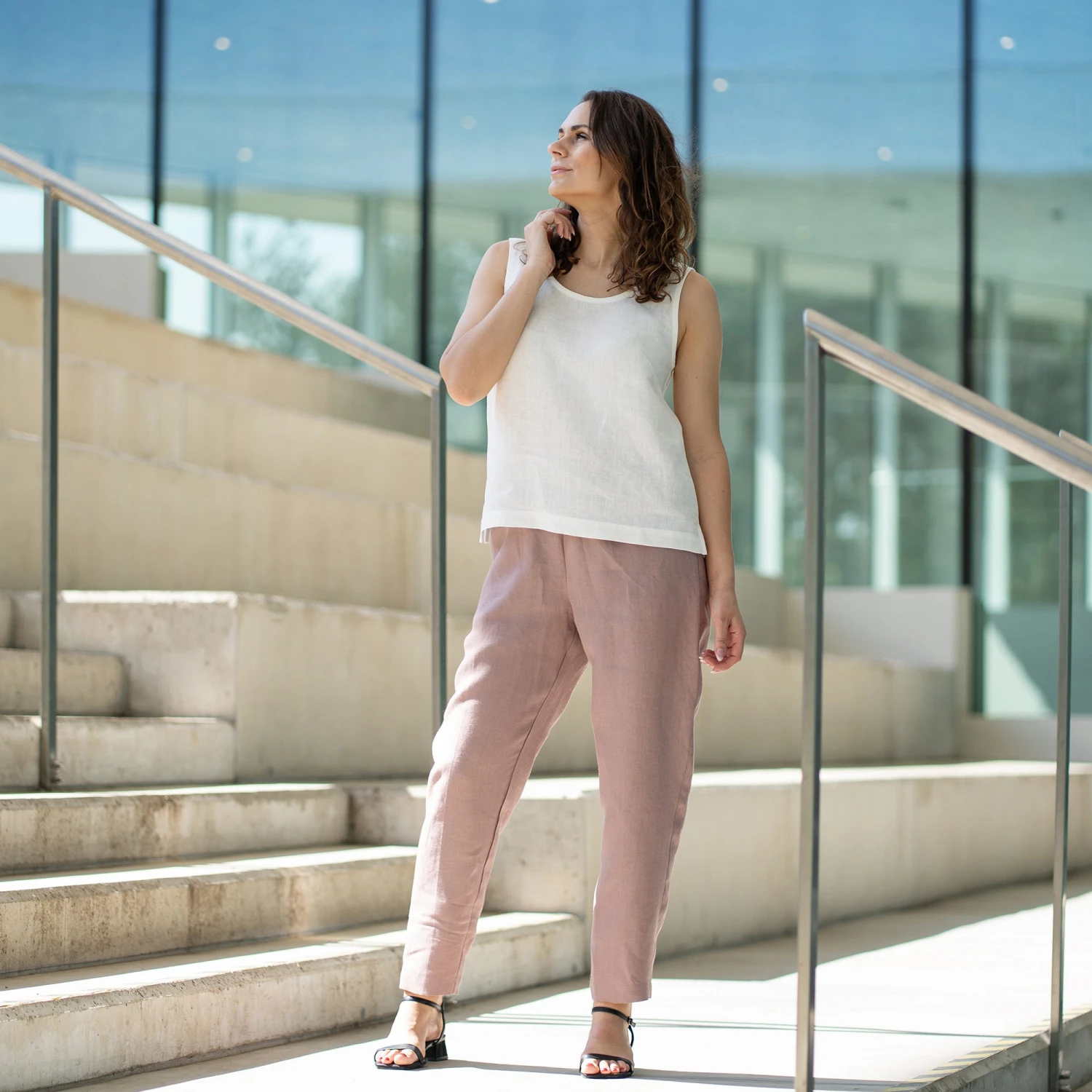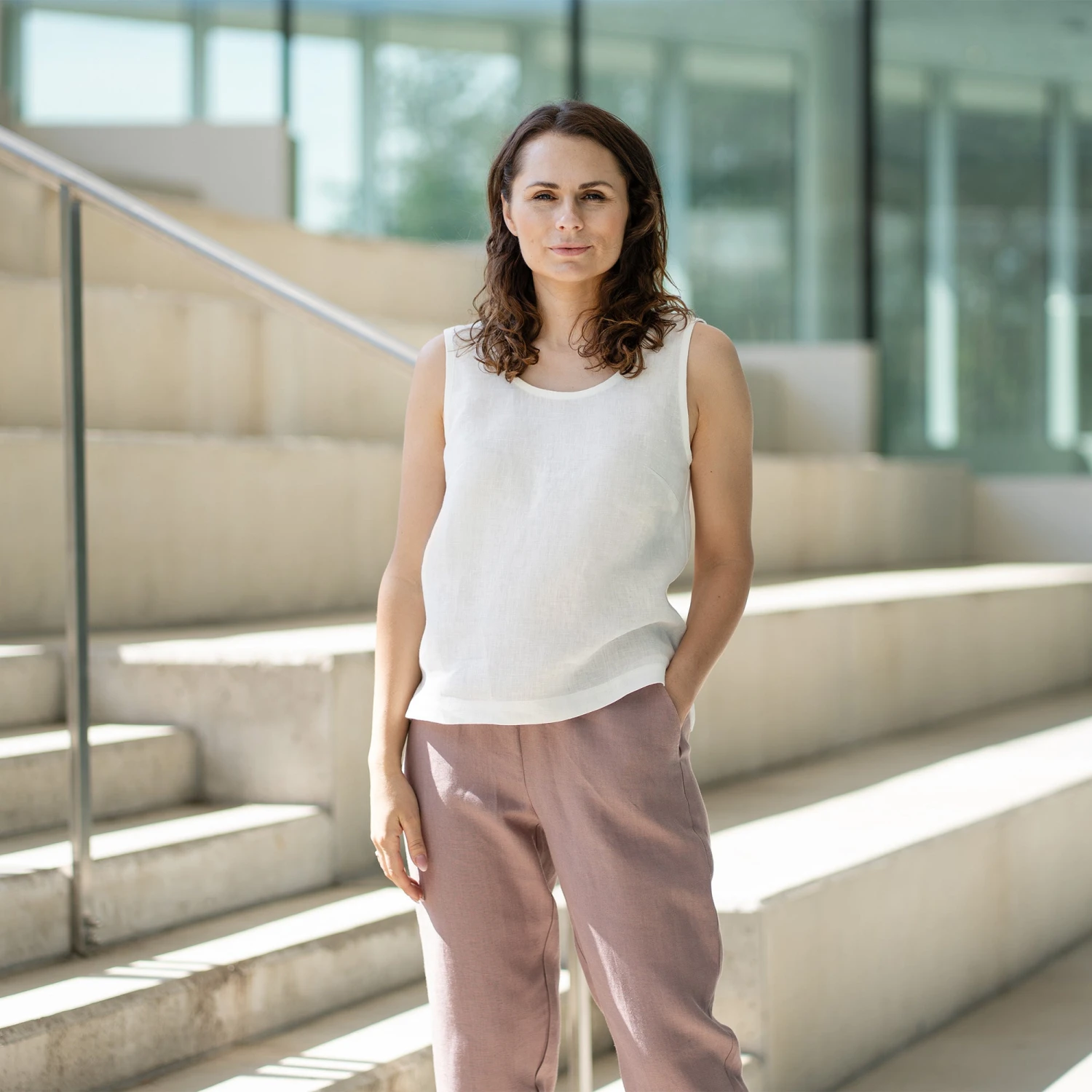 Hana tank top is a breezy summer blouse crafted from hypoallergenic and organic 100% Linen fabric which is known to be extremely breathable, moisture-wicking, and safe even on the most delicate skin. Linen tank features a round neck, relaxed silhouette, and straight cut. With small splits on both sides, linen top is the perfect partner to our high-waisted linen pants Dakota or skirt Sophia.