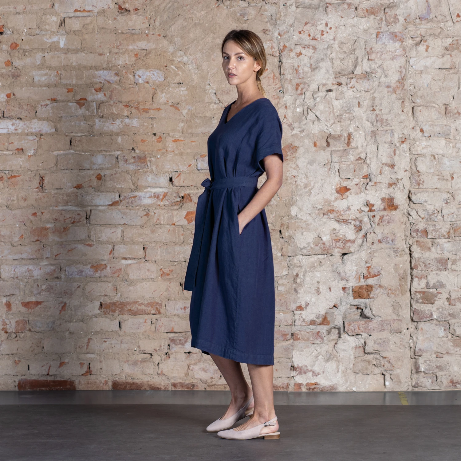 Joelle dress is made from 100% Linen fabric, featuring a flattering V-neckline, a relaxed and roomy silhouette, and midi length which elongates your figure so you look taller and slimmer. Linen tunic also comes with a tie belt that can define your waist. The flowy Linen dress has two hidden inseam pockets that are wonderful catch-alls for any little thing you need or just a perfect place to put your hands in.