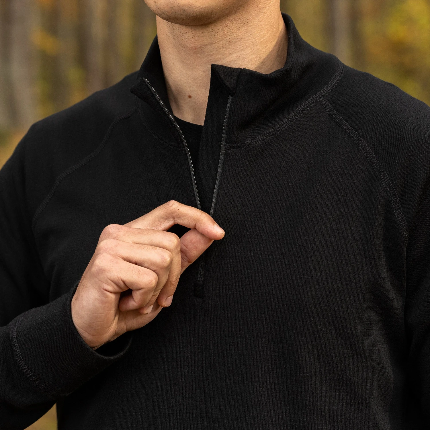 Hiking? Mountain biking? menique understands your passion for outdoor activities, therefore zip neck top for men is here to make sure you do not get chilled. Made of 100% Merino wool, the fabric will embrace your skin giving it a light and soft touch while a simple and comfortable zipper will guard you from the unpleasant wind. One more reason to think about zip shirt is that you can more adapt to changing weather conditions. Zip up for added warmth at the start of the climb, and unzip as you work up a sweat. This classic zip turtleneck is crafted from midweight 250gsm and non-itchy Merino wool, perfect for colder weather and sensitive skin. Classic black color never poses too many questions – it matches all the colors.