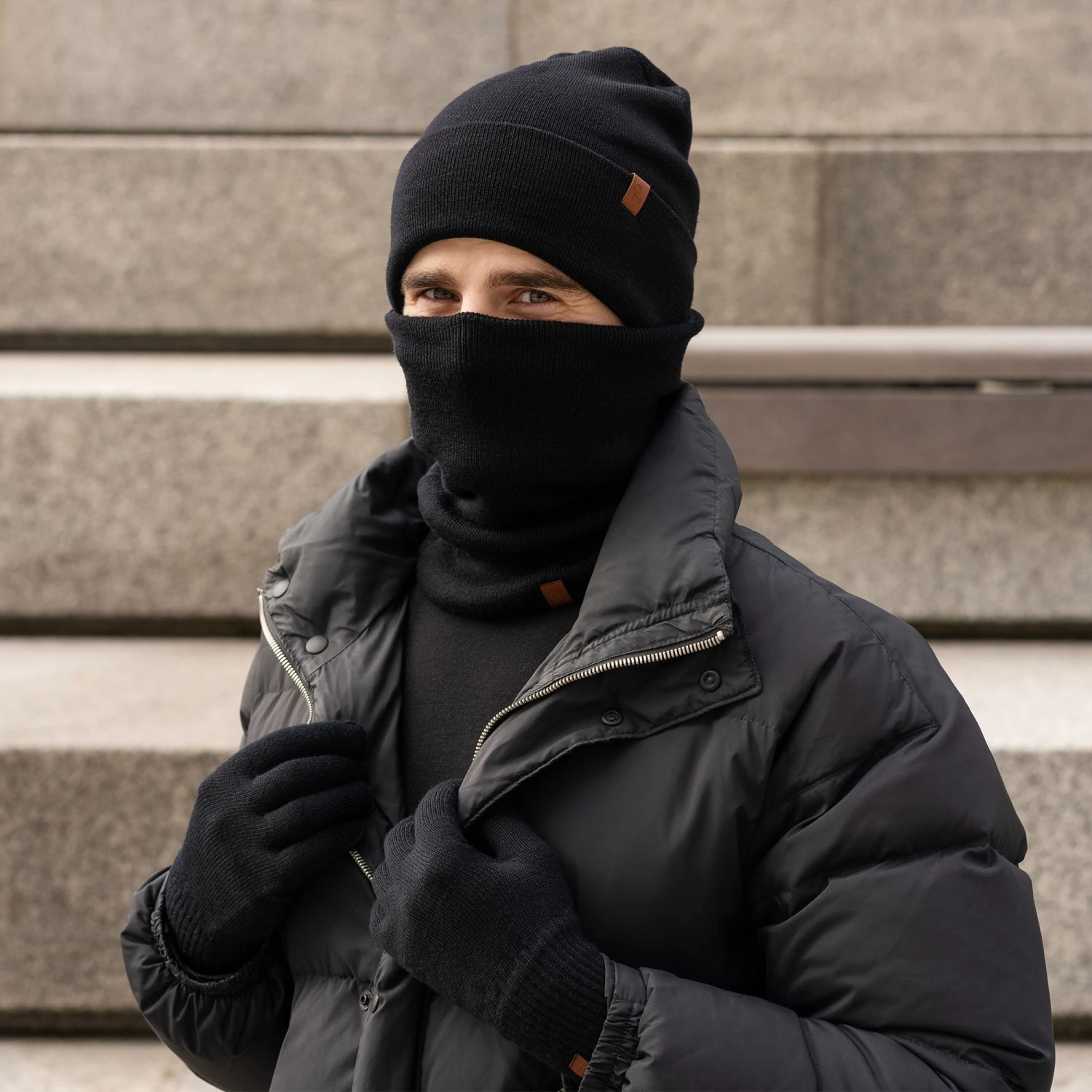 Start your day with our reliable set of knit accessories for men. Featuring knit beanie hat, neck gaiter, and full-finger gloves, this three-piece combo is carefully knitted from 100% Merino wool yarns. These wool gloves can be worn while handling everyday snow or heading to a ski resort – they will handle your business with ease wherever you are. In addition, this mock dickie can be hidden underneath shirts, or jackets, giving the appearance that you are layering overtop of a turtleneck. Not only this turtle neck snood will keep your neck cozy during cool days, but it can add superior warmth without creating extra bulk. With this powerful combo you will feel effortlessly warm and eco-conscious.