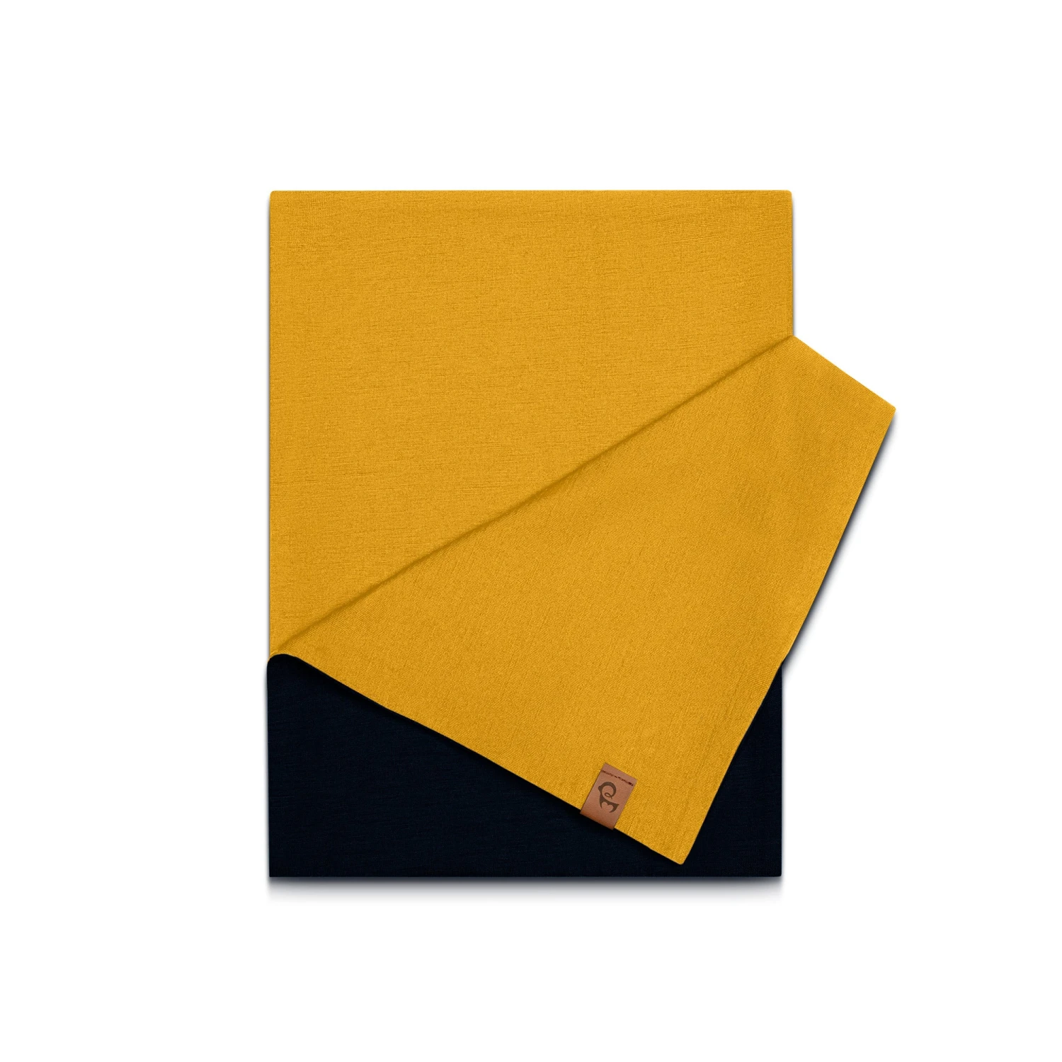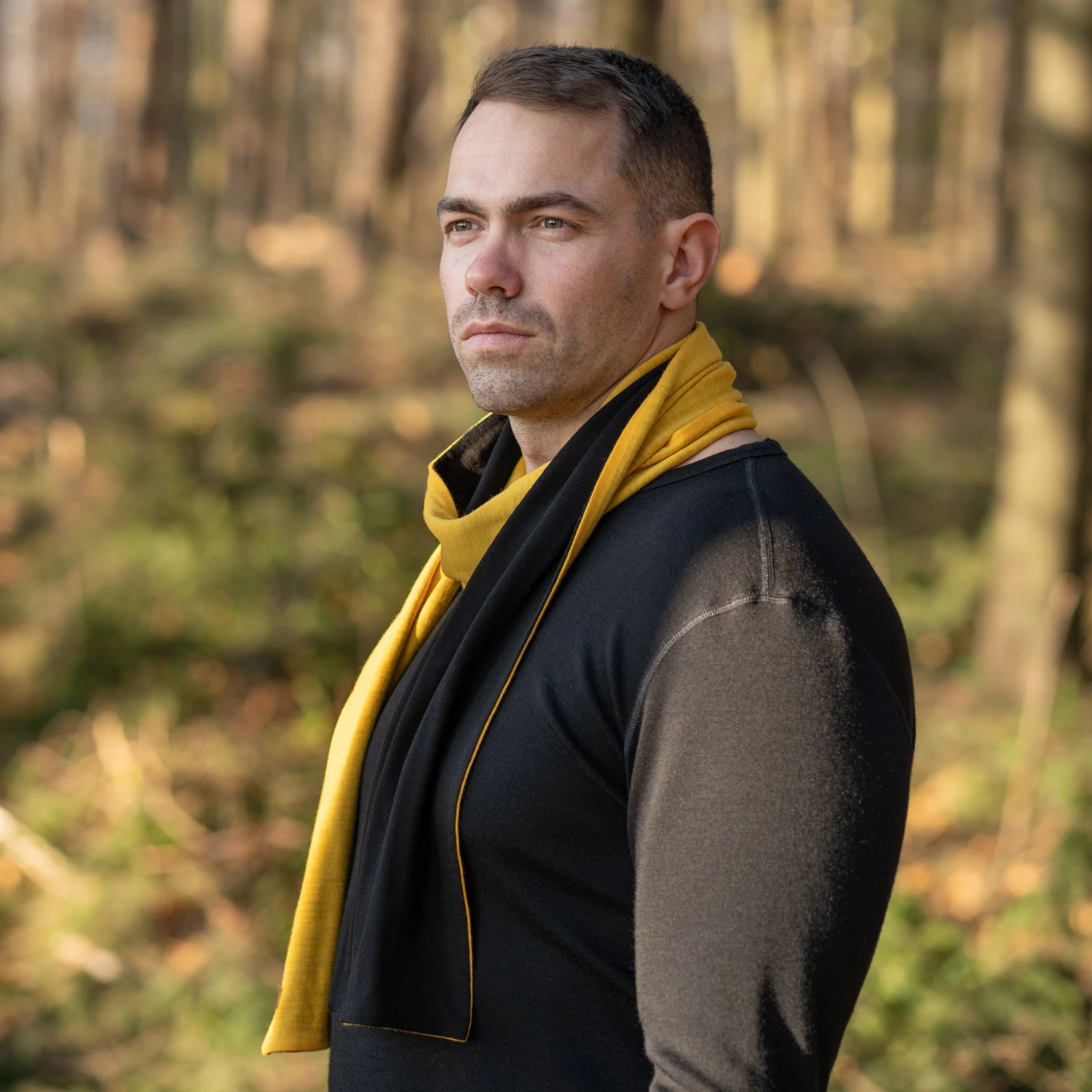 Ethically crafted from 100% Merino wool, the unisex apparel is stretchy, supple, and stays warm when moist. At this point, sweat is drawn out of the fabric to speed up evaporation, ensuring quick drying. Along with the breathable material, the sensational garment has thermoregulation properties that allow you to stay warm and cozy while out and about. Between the two vibrant shades of yellow-orange and black, it is like two scarves in a one.