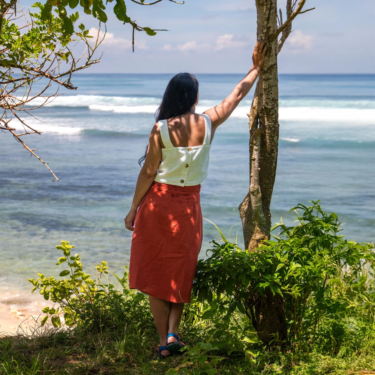 Soft and breathable, our linen wrap skirt – designed to gently hug your body – offers an adjustable fit for all-day comfort. The sewn-in belt lets you customize the waistline, allowing you to choose between a relaxed or more fitted look. This thoughtful design enhances the skirt’s silhouette – adding a touch of elegance to its overall style.
