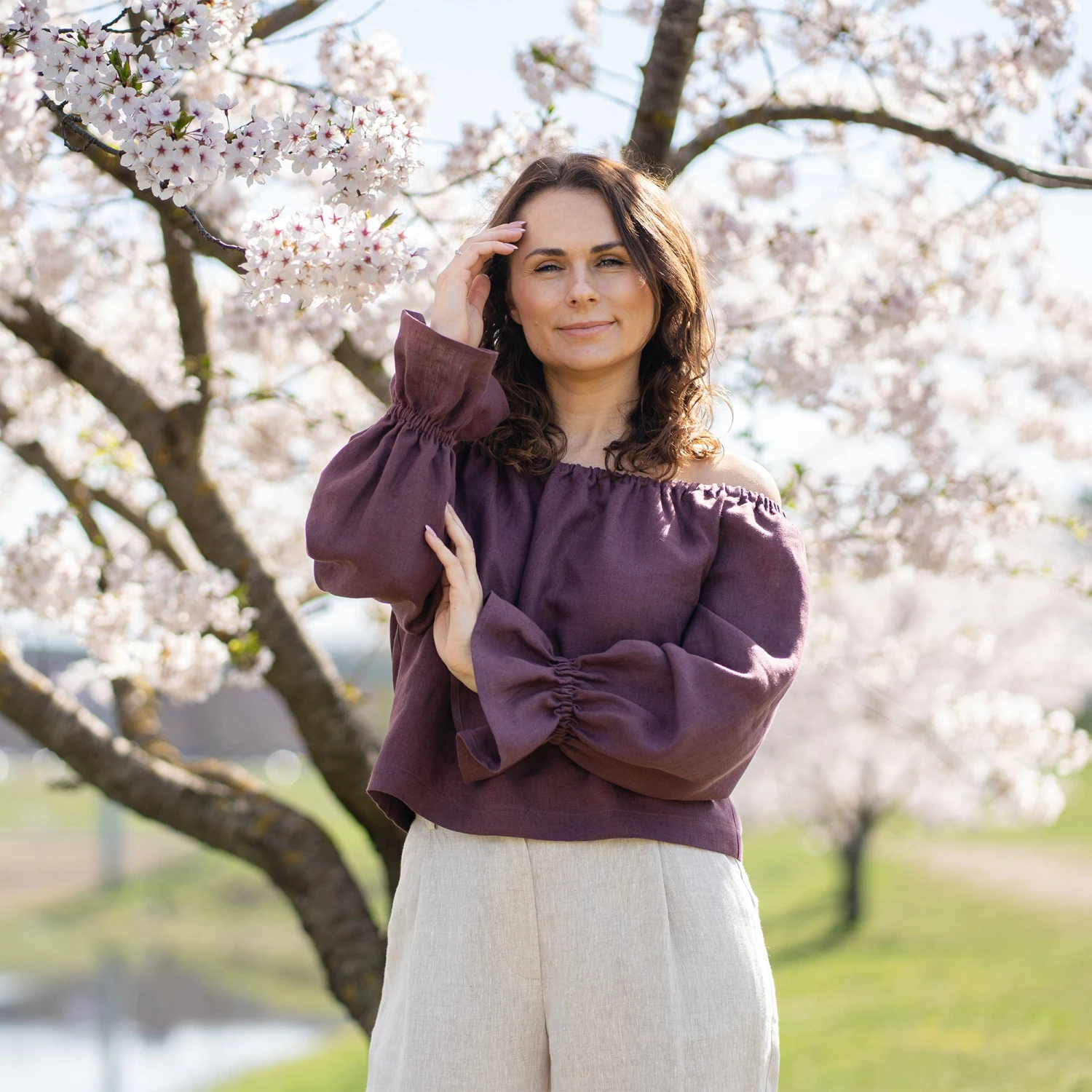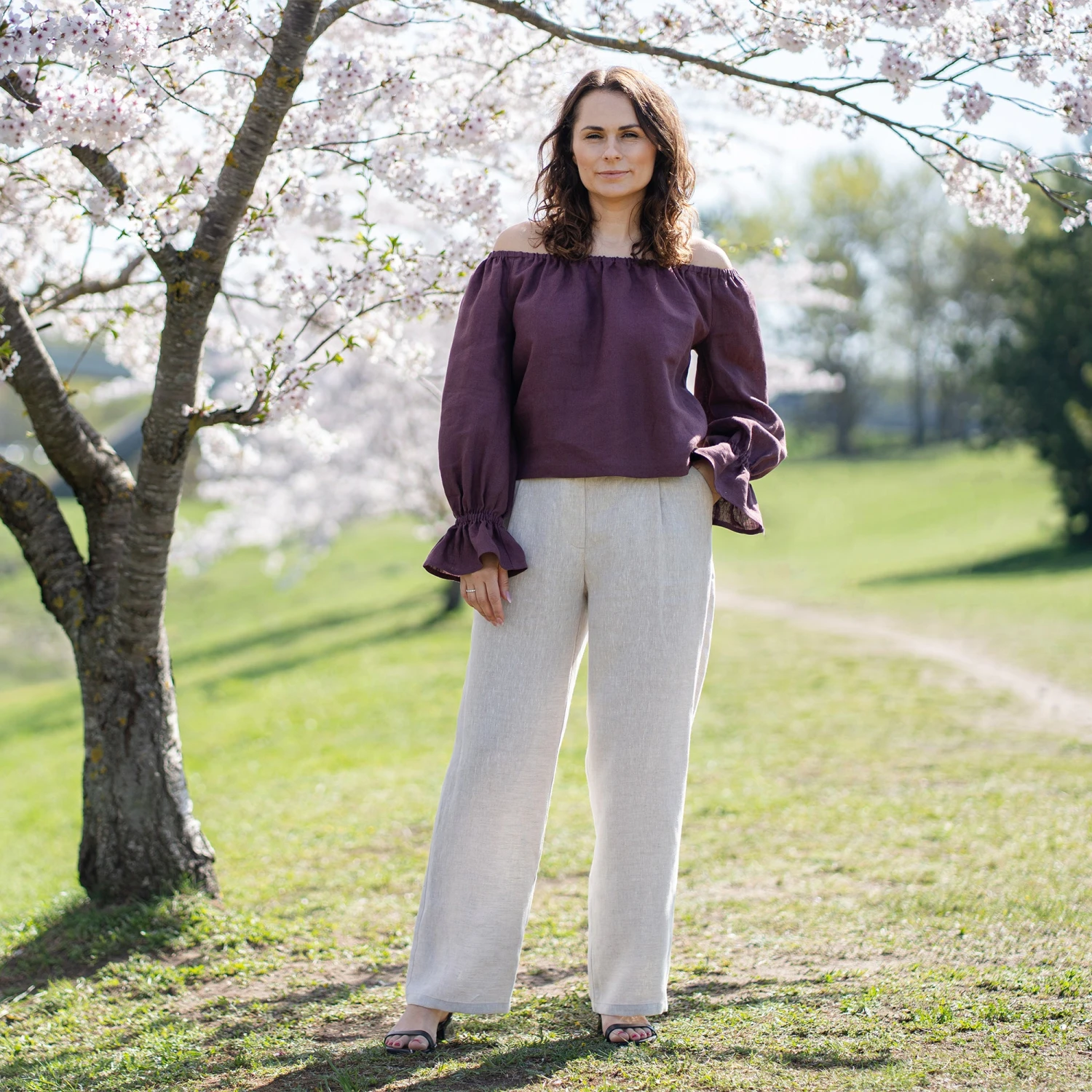 Showcase your shoulders with our off the shoulder Linen top Jessica. Made from lightweight premium Linen, this long sleeve top offers a soft, caressing feel, while the elastic neckline and wrists ensure a comfortable fit. Whether it’s a candlelit dinner or a romantic rendezvous, this puff sleeve blouse is perfect for special events. Embrace the magic of love and captivate hearts with this enchanting garment!