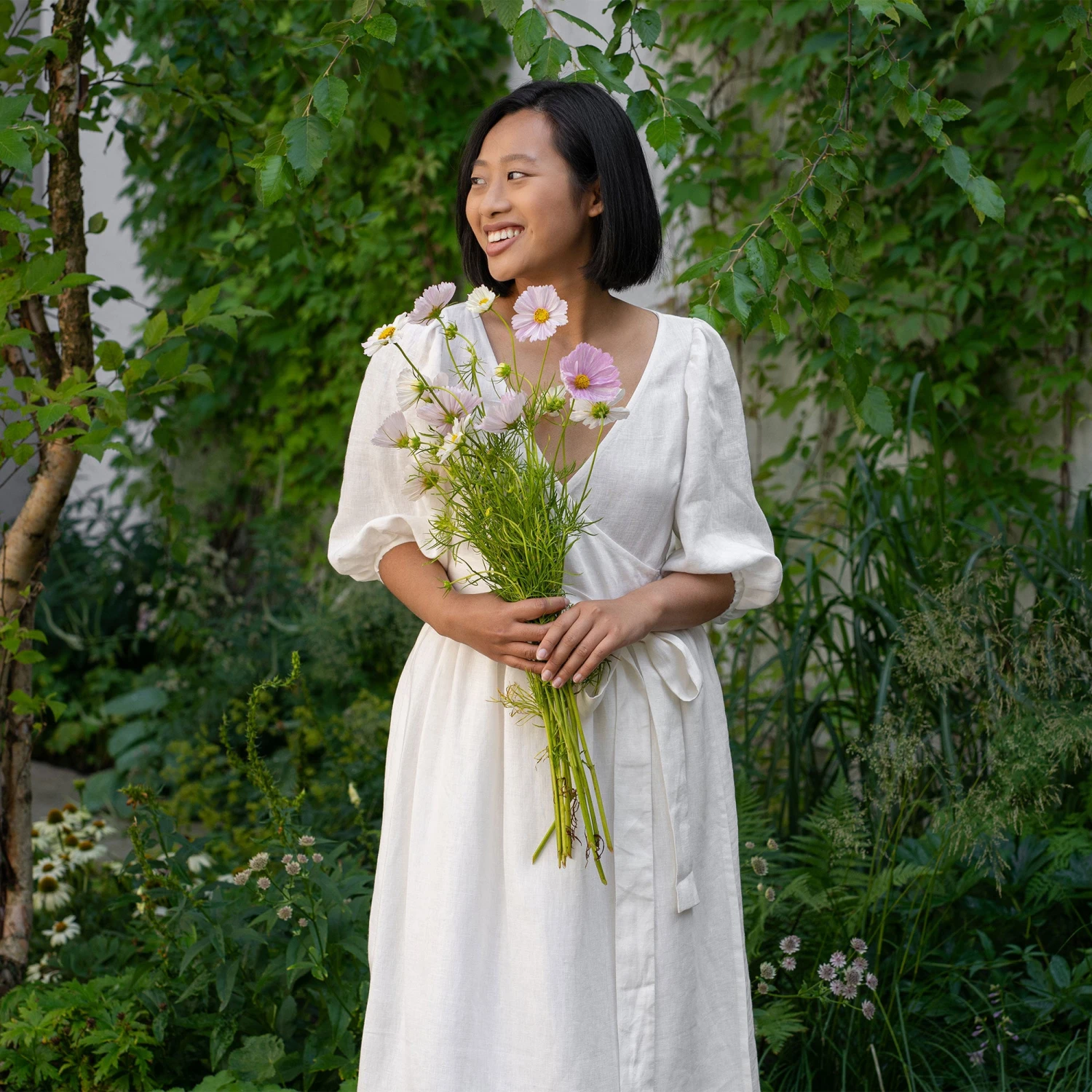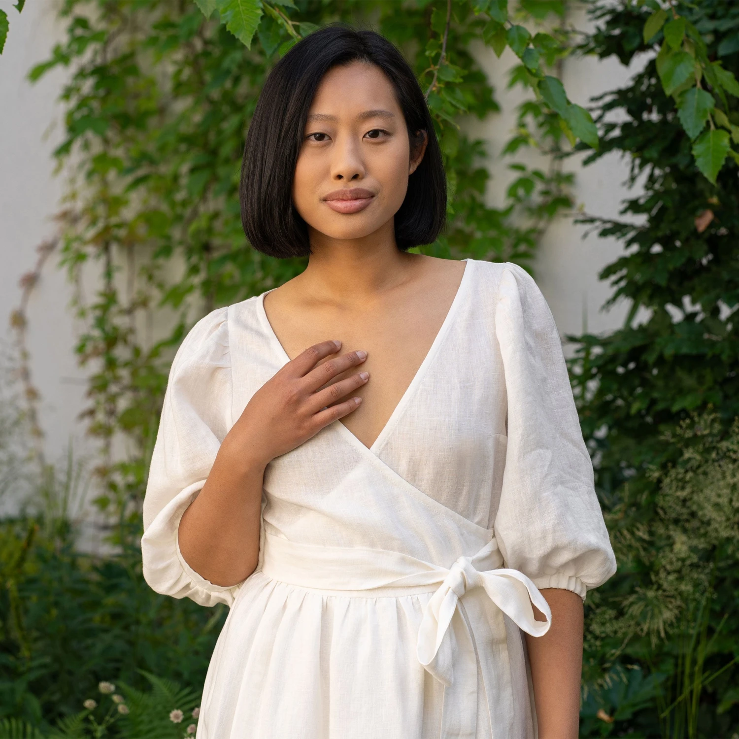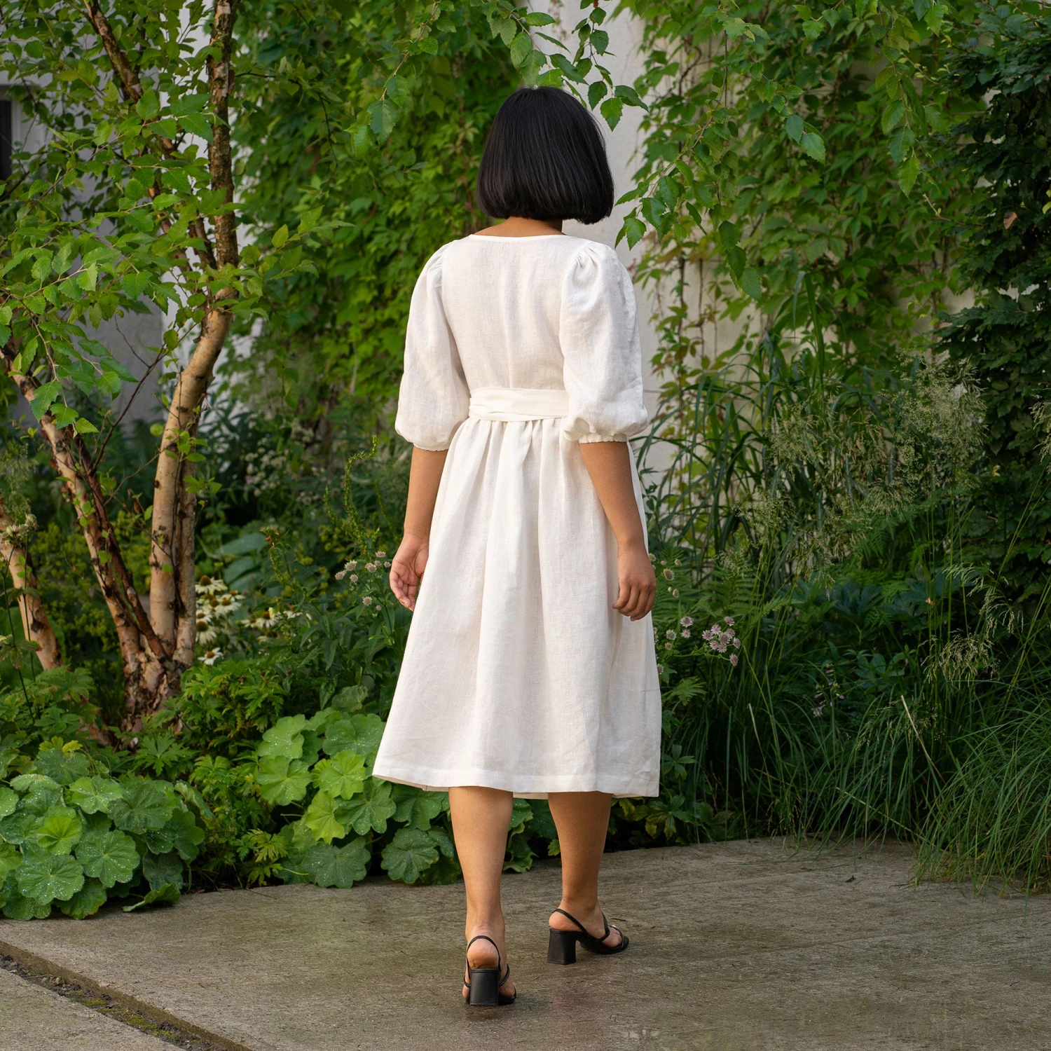 Linen wrap dress Belle features puff sleeves, flattering V-neckline, and a wrap silhouette with waist-cinching ties. Slip pockets and a midi length adds more practicality , making it perfect for picnic dates or leisurely lunches.