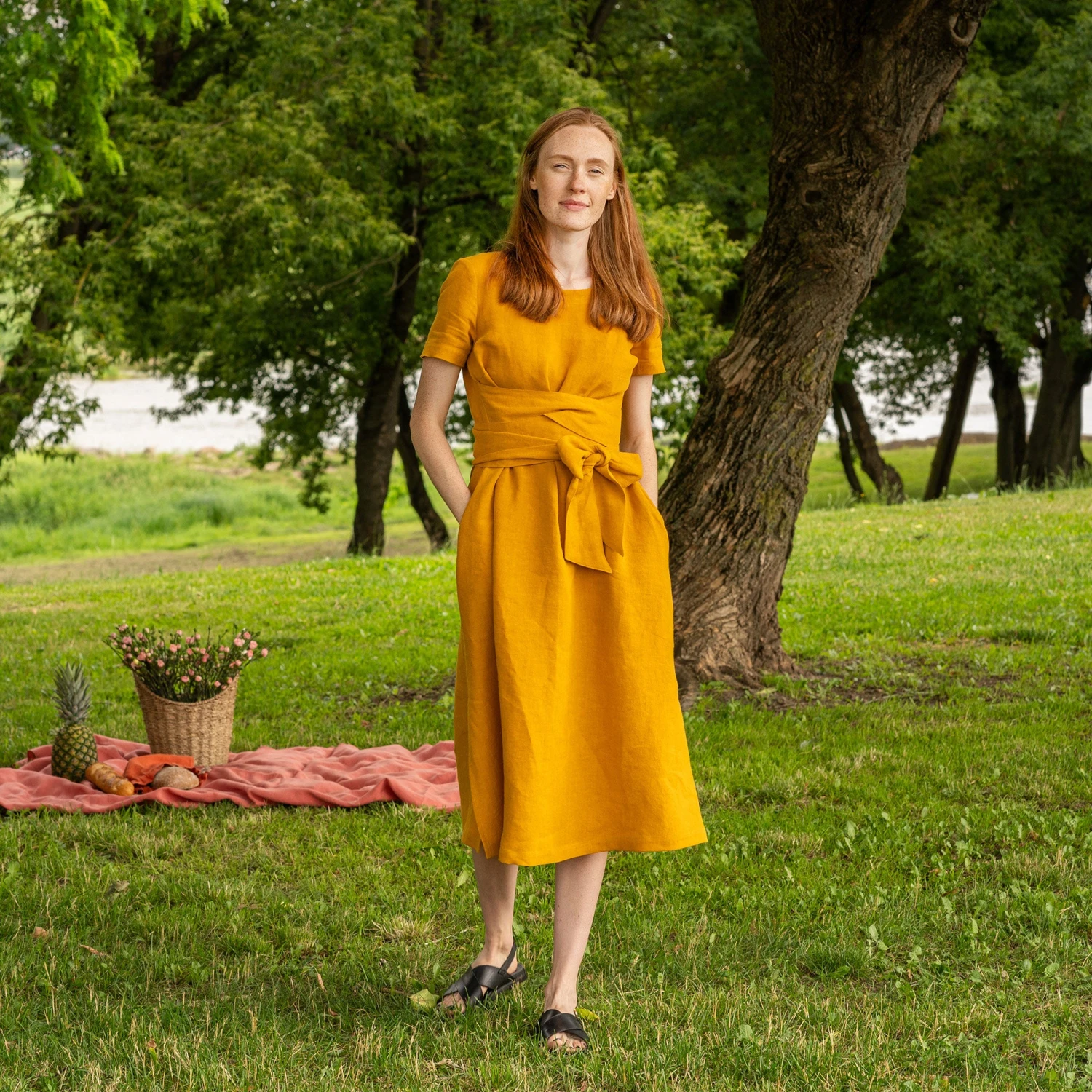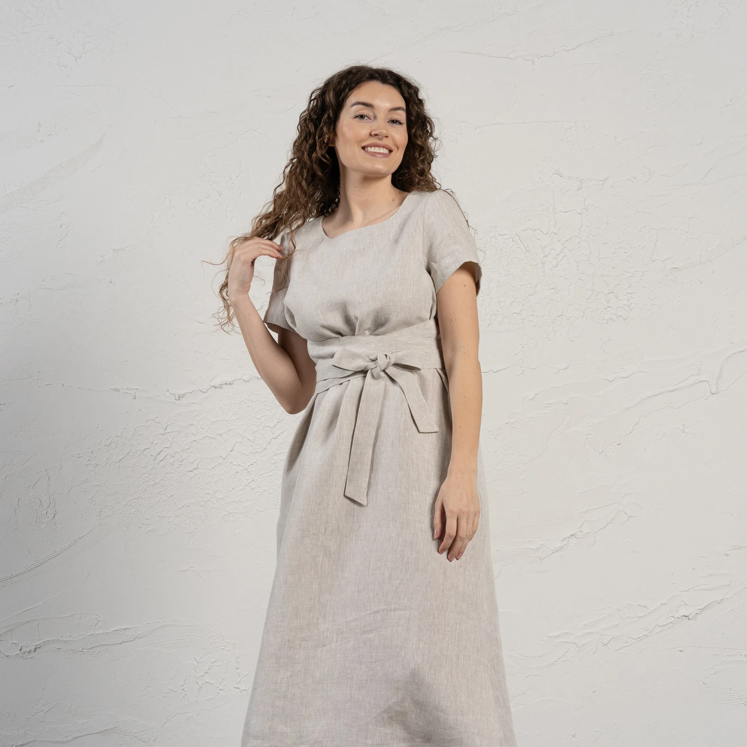 Linen summer dress Milly offers effortless comfort and timeless style. Featuring a unique obi belt, this casual dress wraps around and defines the smallest part of the waist for a universally flattering fit. The wide waist tie enhances the silhouette, while the midi length, side slits, and hidden pockets add both elegance and functionality. Perfect for warm-weather days, this 100% linen dress transitions seamlessly from casual outings to special occasions with ease.