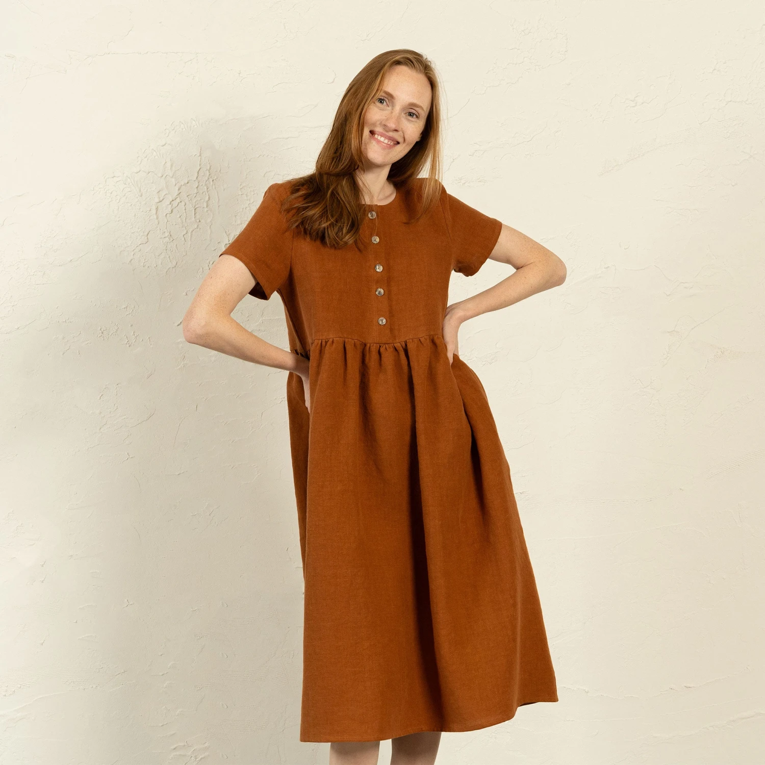 Maria dress features a relaxed and roomy fit, this 100% Linen dress combines the round neckline, two hidden pockets, and set-in short sleeves. On top of that, a functional button-down front allows the ability to easily nurse, so it is suitable for breastfeeding mothers.