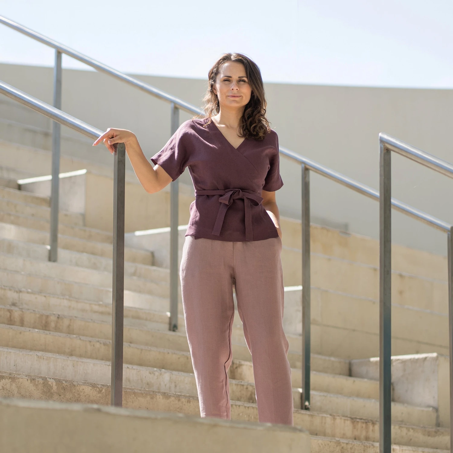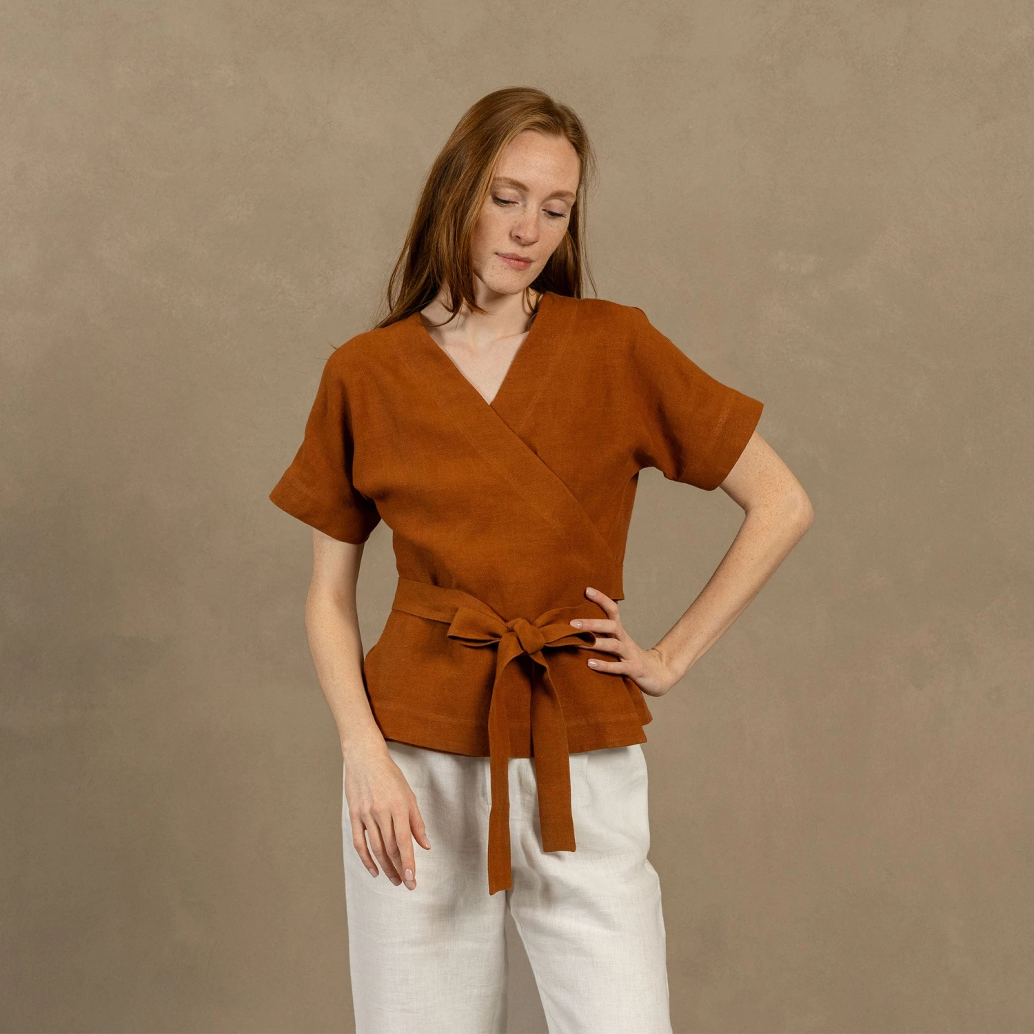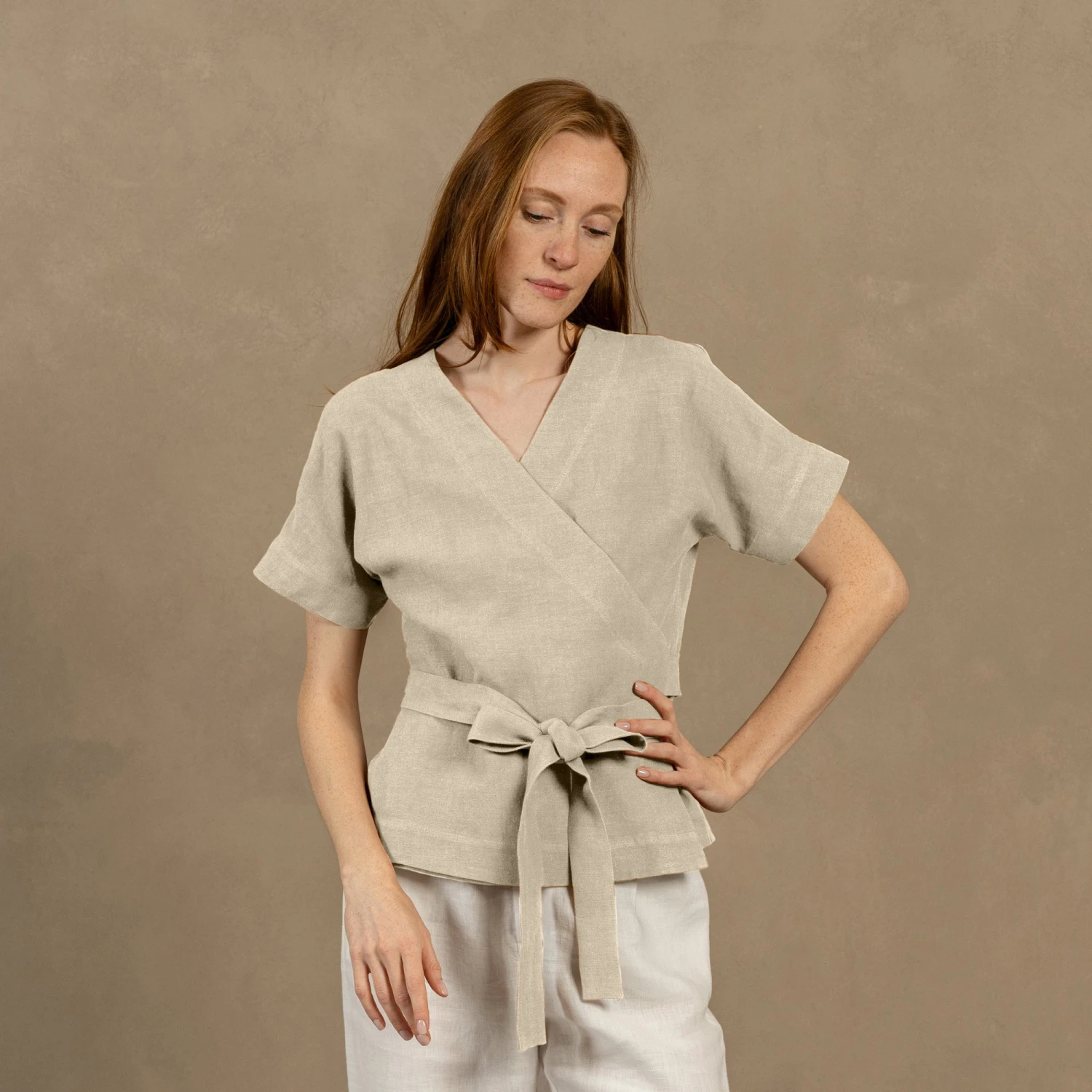Dive into comfort and elegance with our Linen v-neck wrap blouse Lila. Made from 100% natural Linen, our garment prioritizes breathability and durability while ensuring hypoallergenic properties. Wrap design of this linen kimono top offers endless styling possibilities, making it a perfect choice for any occasion. Elevate your wardrobe with this versatile short-sleeve wrap top.